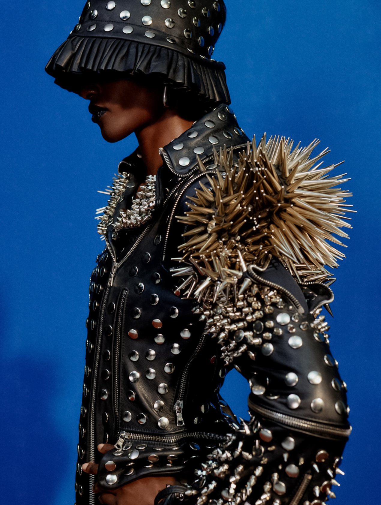 Model Sienna King makes a strong-woman, dramatic-fashion statement in ‘A Dash of Daring’, styled by Jenny Kennedy. Photographer Ekua King [IG] is in the studio, creating a visually compelling fashion story for ELLE UK July-August 2022./ Hair by Yumi Nakada-Dingle; makeup by Celia Evans