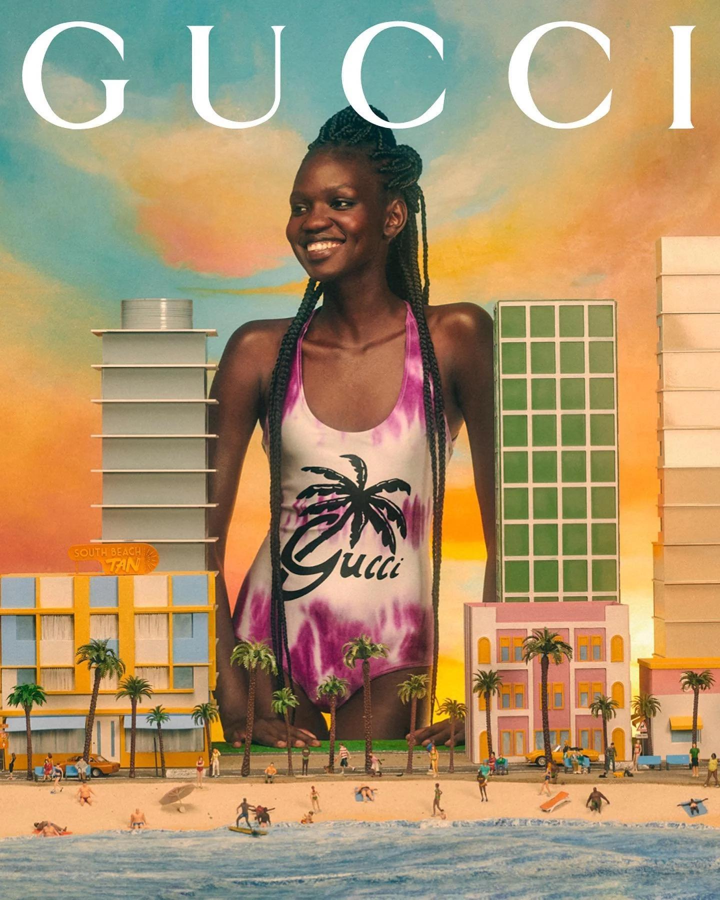 To present the product selection in a surreal and playful way, photographer and director Max Siedentopf has captured a campaign where the Gucci Resort pieces take on monumental status in mini dioramas of the various resort destinations. Tote bags and sunglasses become part of the landscape, while beach-goers bring larger-than-life energy to the frozen-in-time scenes—a reminder that unexpected stories are still to be discovered even in the most familiar destinations.
