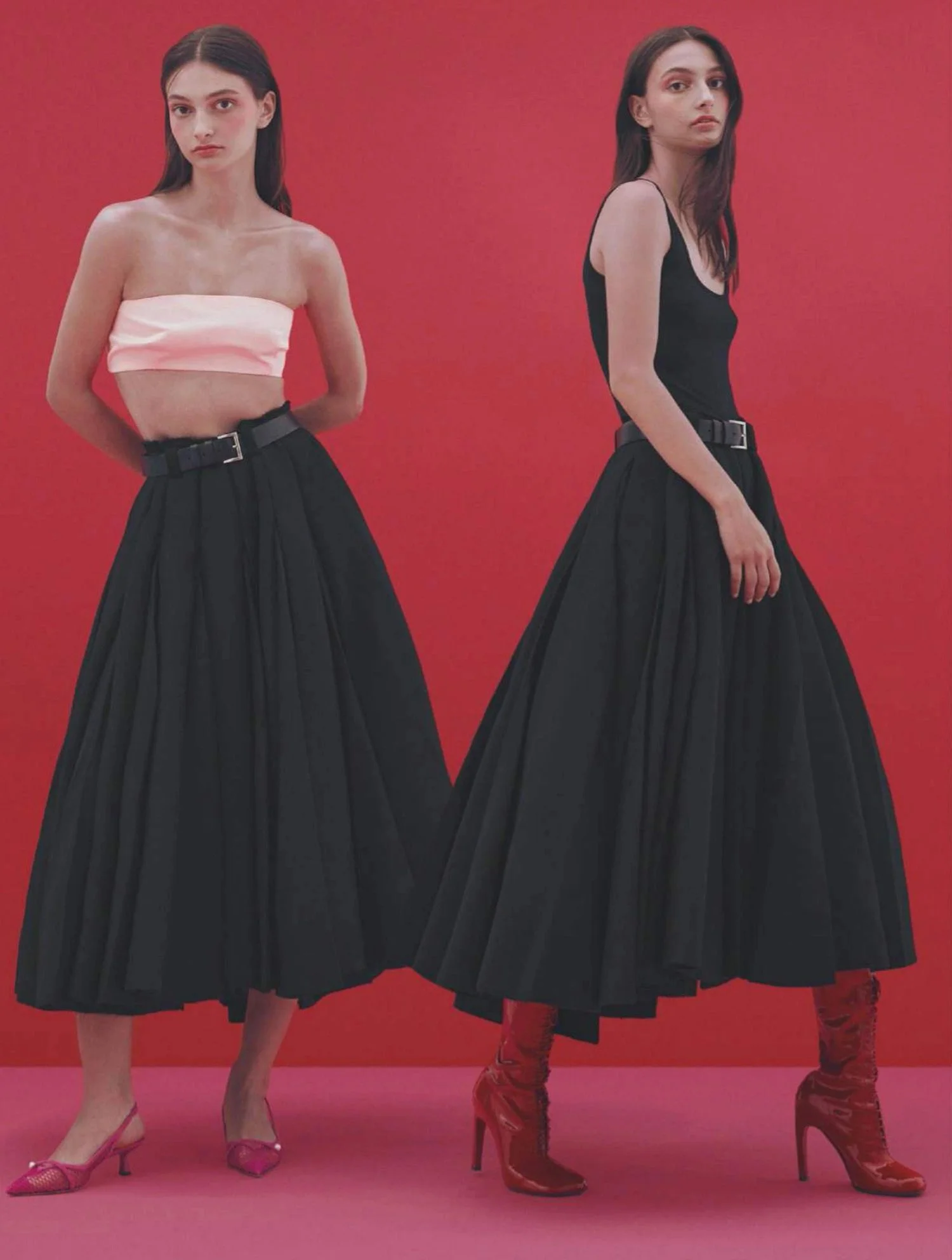 /Model Irene Franco Frances sees double, styled by Piluca Valverde in Blumarine, Celine by Hedi Slimane, Prada, Versace, Zara and more in a modern, minimal, streamlined clothes in black, coral, pink, red, Photographer Daniel Rojas [IG] is in the studio for InStyle Spain’s September 2022 issue./ Hair & Make-up: Miguel Ángel Gómez Tragacete