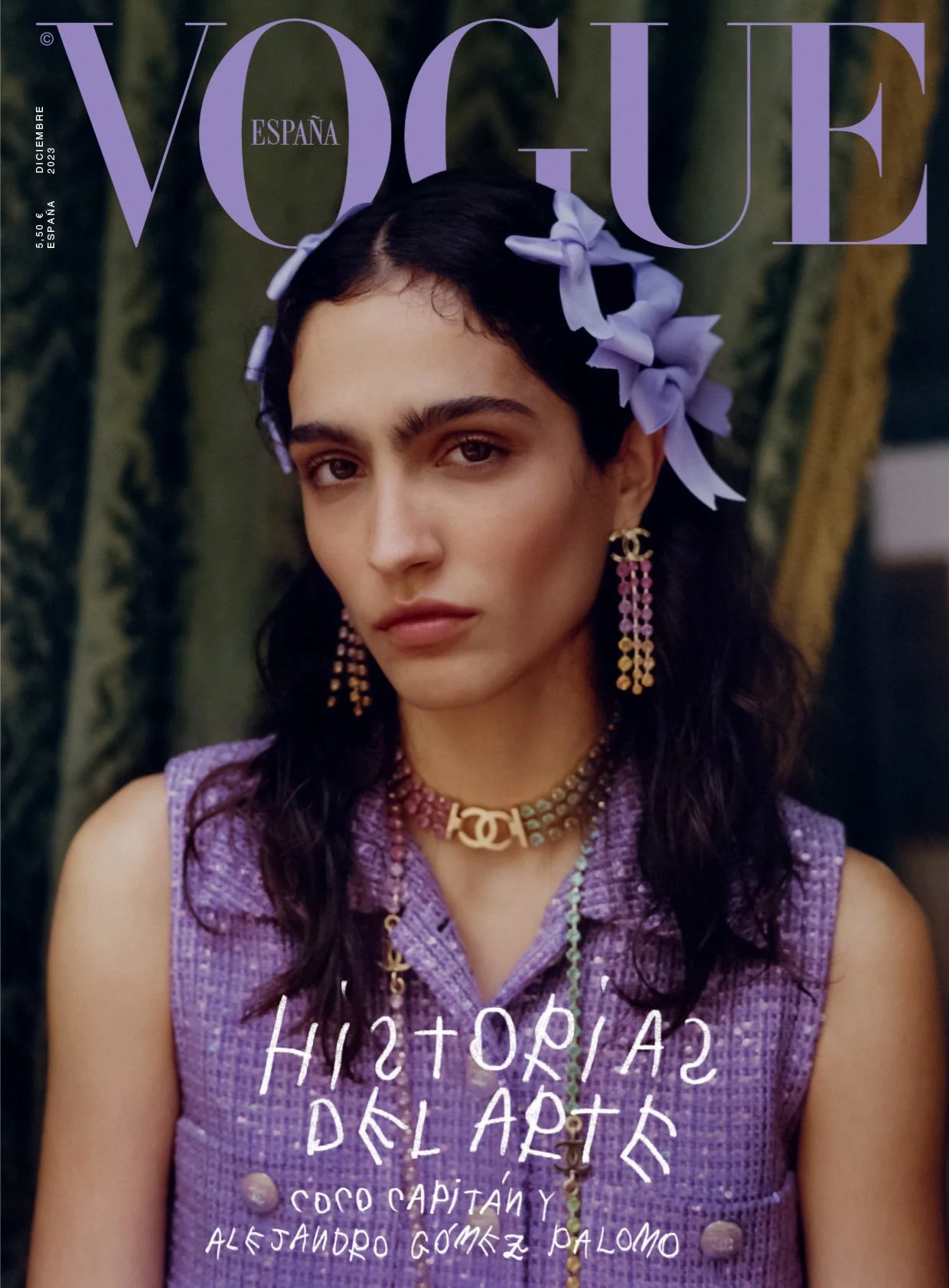 Model Sara Caballero wears total Chanel on the cover and is styled by Palomo in the fashion story ‘Nonina’. Capitan lensed the editorial at Palacio de Moratalla in Cordoba. / Hair by Claire Moore; makeup by Elena Bettanello
