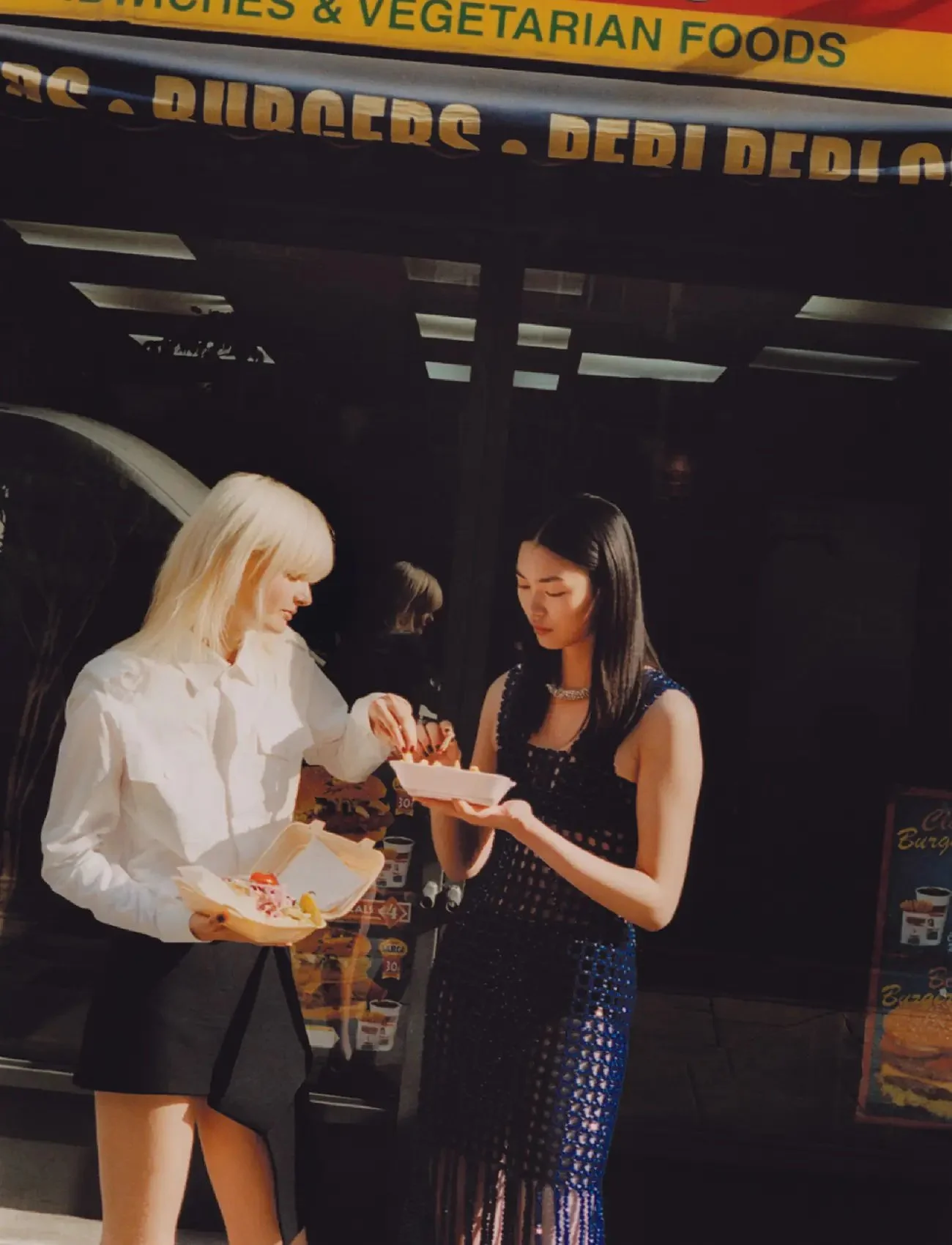 Models Bo Exters and Bingbing Liu are out and about in London, showing off glam fashion from styled by Flossie Saunders.