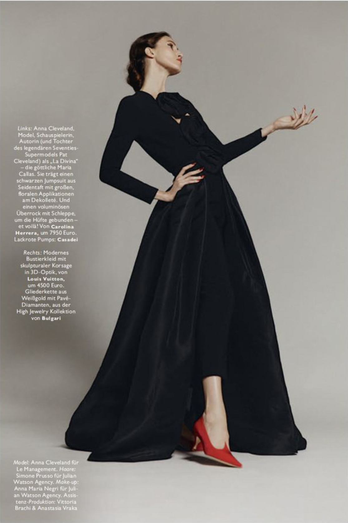 /It’s highly unusual that a model would perform as a renowned opera star twice in one month. Top model Anna Cleveland is that person, appearing first in the December 2023 issue of Vogue Greece as Maria Callas.