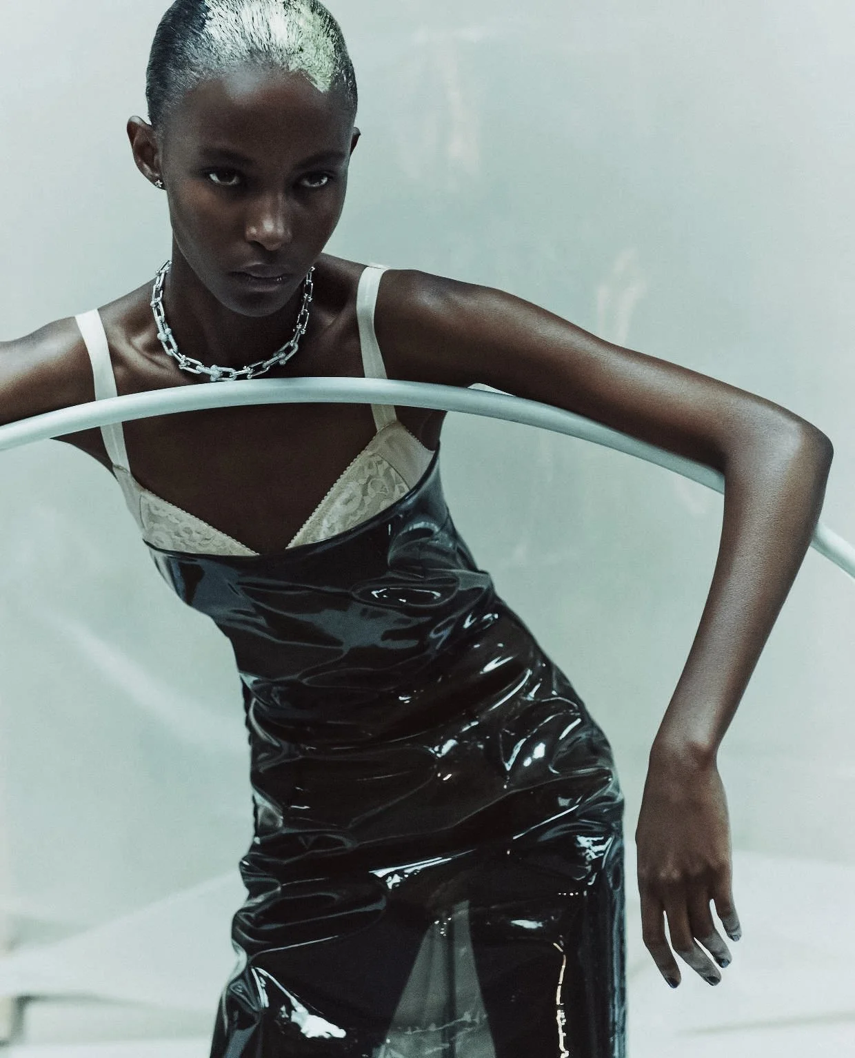 In this fashion story, Dutch-Somali model Muna Mahamed is styled by Sissy Vian in ‘The Silver Factory’, lensed by Melanie+Ramon [IG]. / Makeup by Marie Duhart; hair by Pier Paolo Lai