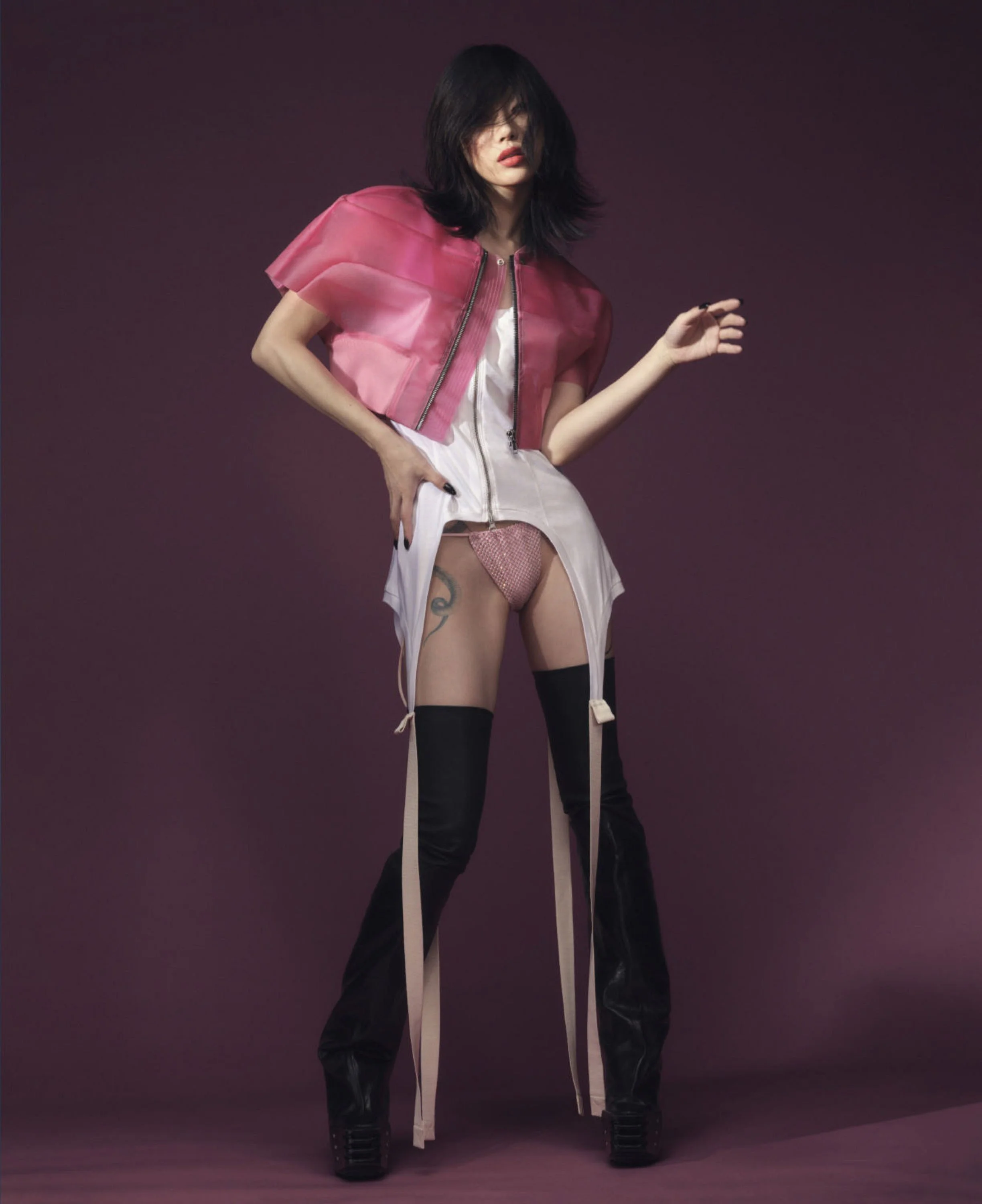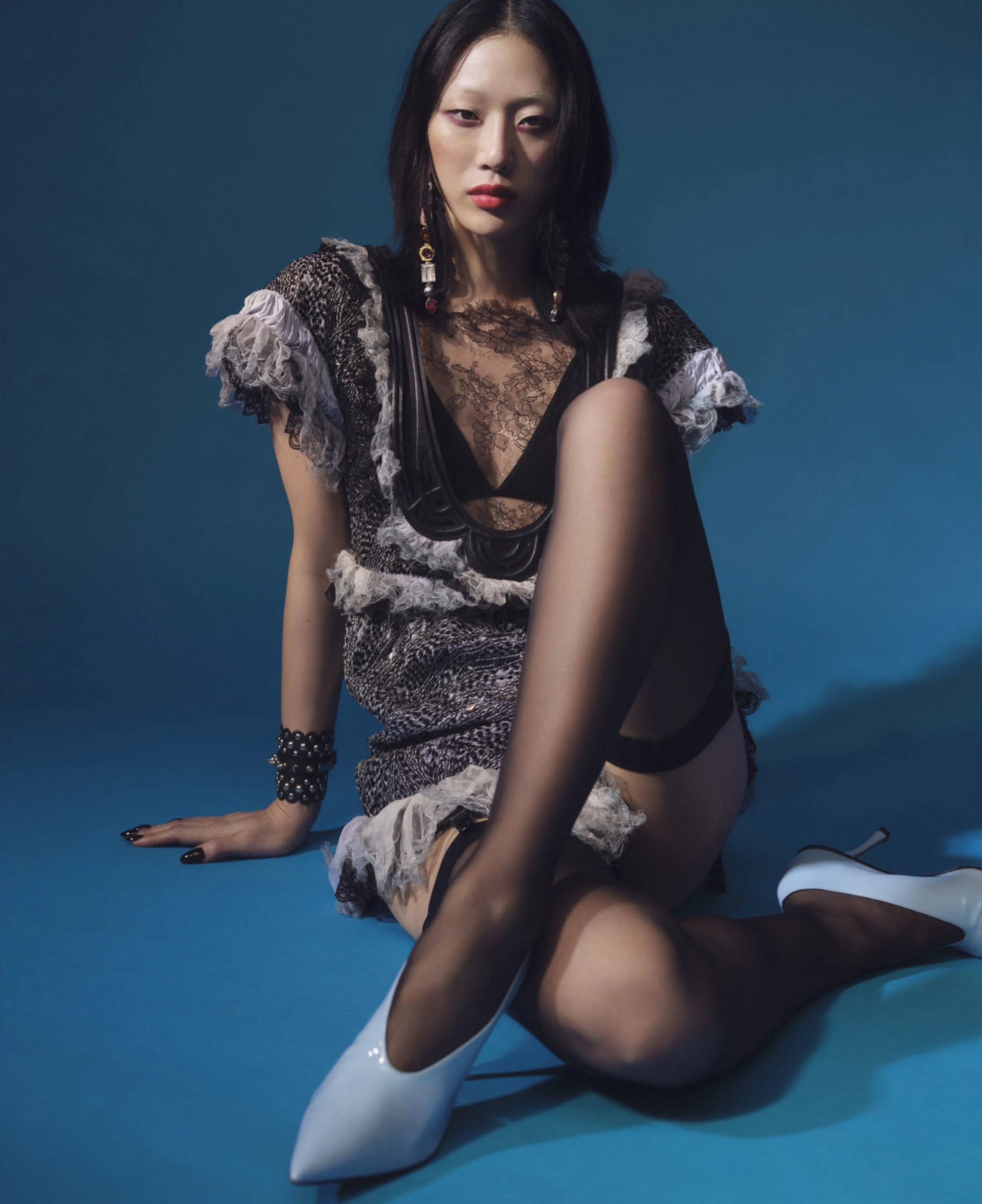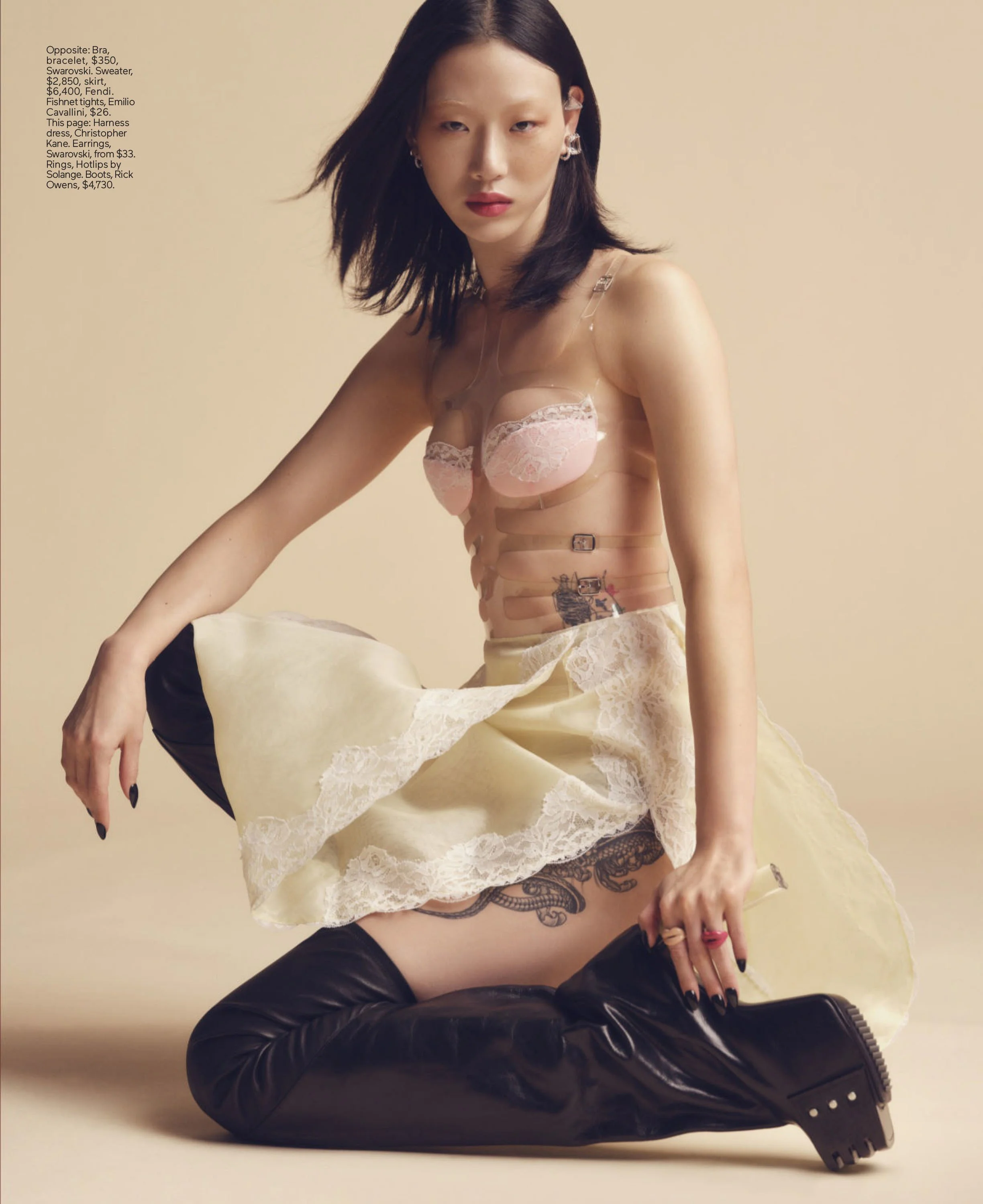 /As fashion once again embraces sensuality, lingerie dressing is again a trend. In the case of top model Sora Choi, Alex White chooses a punkish spin with suspenders and buckles on sheer and fragile fabrics from Christopher Kane, Dolce & Gabbana, Fendi, Gucci, Louis Vuitton, Valentino and more. Even Chanel courts buyers with a strapless harness dress.