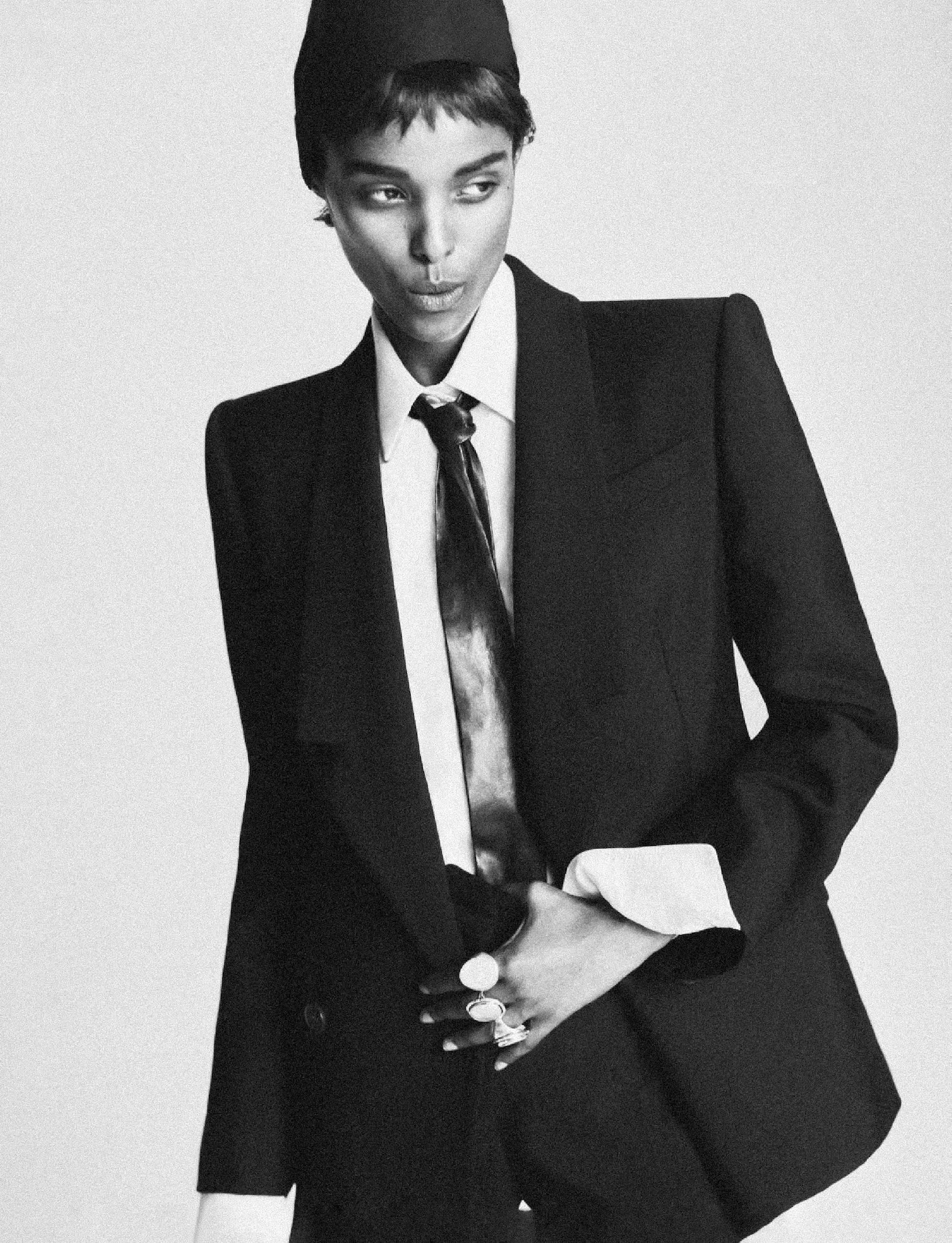 Menswear influences make a strong appearance in Malika’s fashion story, also called by ELLE France the ever-popular “boyish look” in French fashion. Géraldine Saglio styles the shoot, with Chris Colls [IG] resuming his position behind the lens. / Hair by Odile Gilbert; makeup by Wendy Rowe