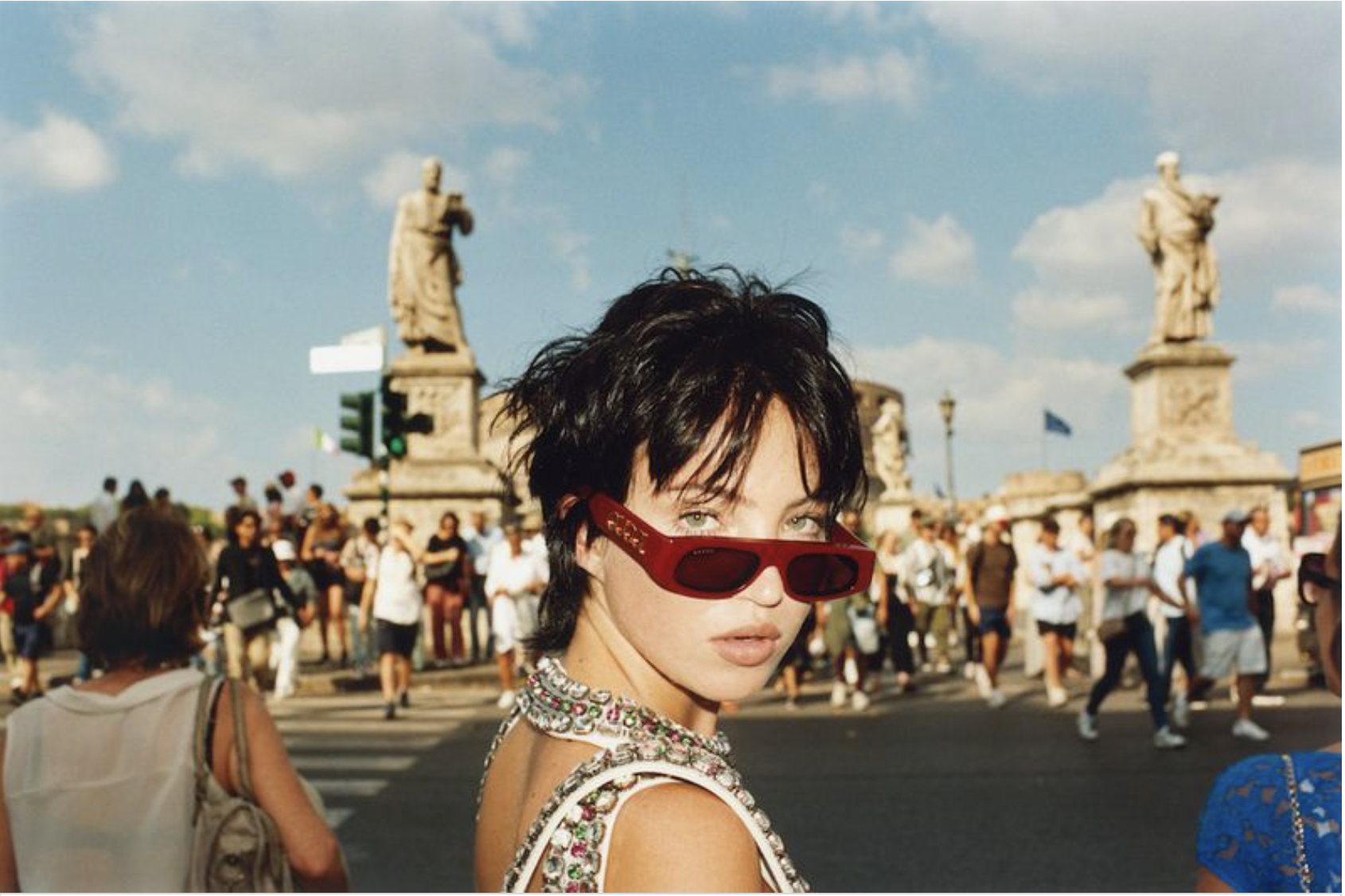 Model Lila Moss is styled by Gabriella Karefa-Johnson in a Gucci advertorial ‘My Roman Empire’. Photographer Theo Liu [IG] is behind the lens for British Vogue February 2024./ Hair by Benjamin Muller; makeup by Kali Kennedy