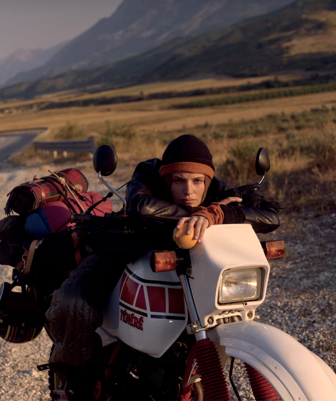 Breslin is on location in Albania for ‘Road Runner’, motorcycle style fashioned by Anastasia Barbieri in Bottega Veneta, Coach, Celine, Chloé, Dior, EgonLab, Emporio Armani, Giorgio Armani, Gucci, Hermés, Hereu boots, Isabel Marant, Lemaire, Loewe, Loro Piana, Louis Vuitton, Maison Margiela, Marko Helmets, Michael Kors Collection, Miu Miu, Paris Texas boots, Pendleton, Polo Ralph Lauren, Prada, Tatras-Official, The Row, Torc Helmets, Ulla Johnson ,