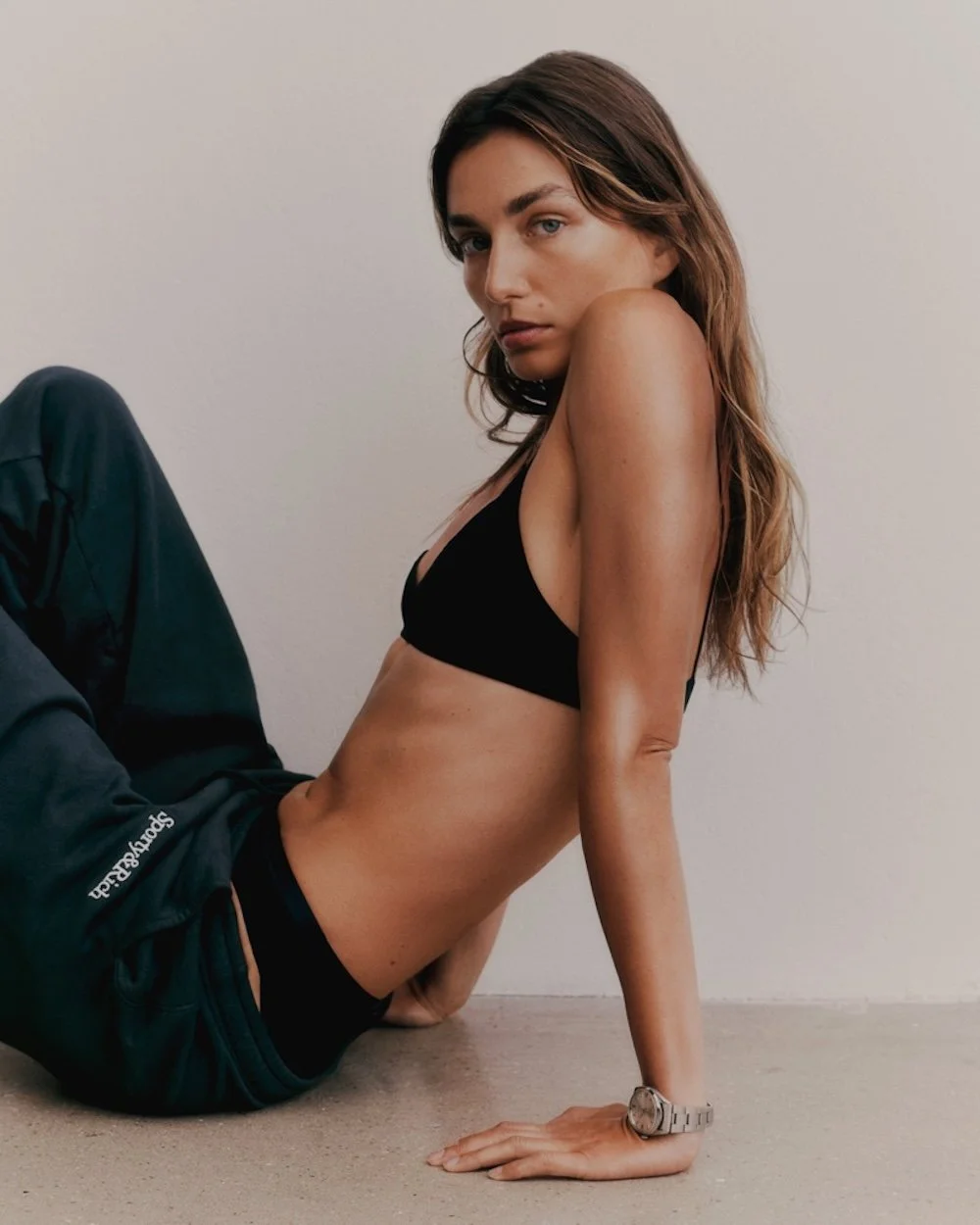 Top model Andreea Diaconu showcases the Core Collection, lensed by Dudi Hasson [IG], in shots that include sports bras, sweatpants, shorts, and casual tees. The volume is low-level in colors and styling except for the Sporty & Rich logo. There is a denim jacket in the CC.