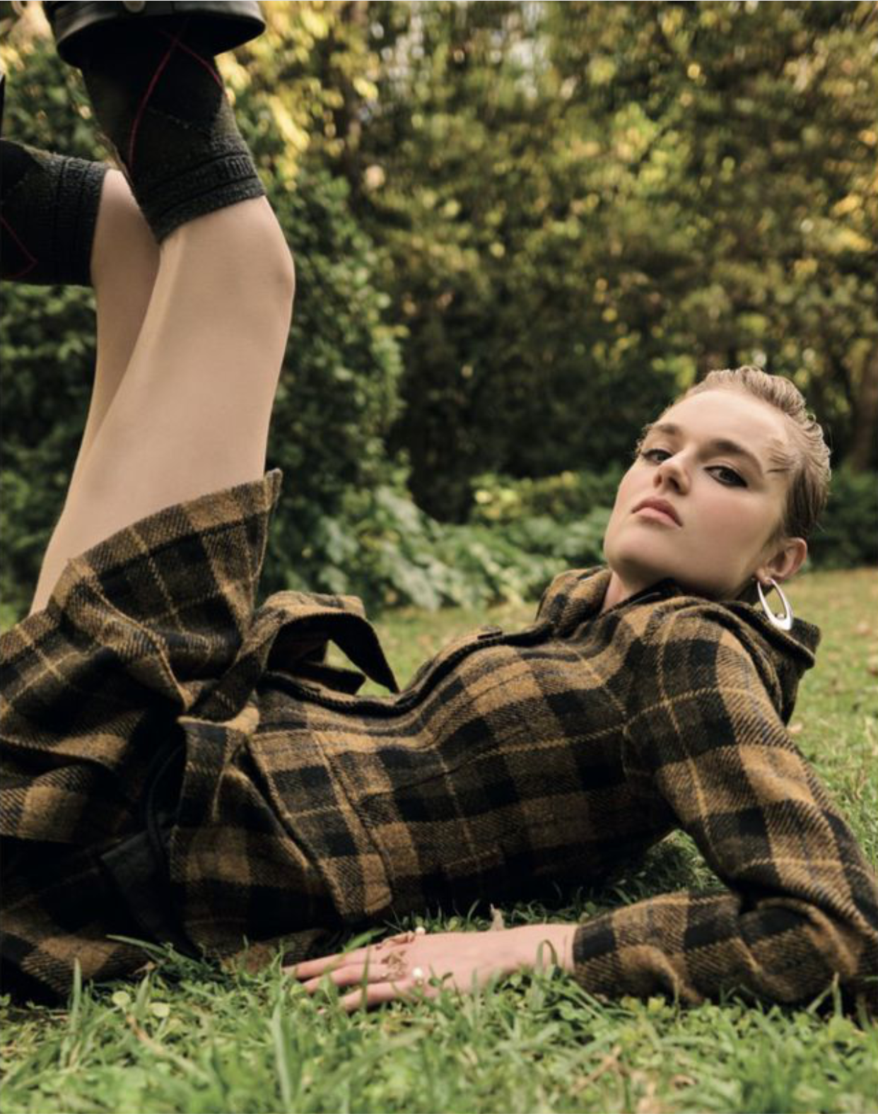 /New girl Sasja van der Jagt poses in ‘very Scottish’, styled by George Katapetis in noble origins fashion from AMI Paris, Bottega Veneta. Chanel, Chloé, Dior, Dries Van Noten, Gucci, Louis Vuitton, Polo Ralph Lauren, Rabanne and Valentino.