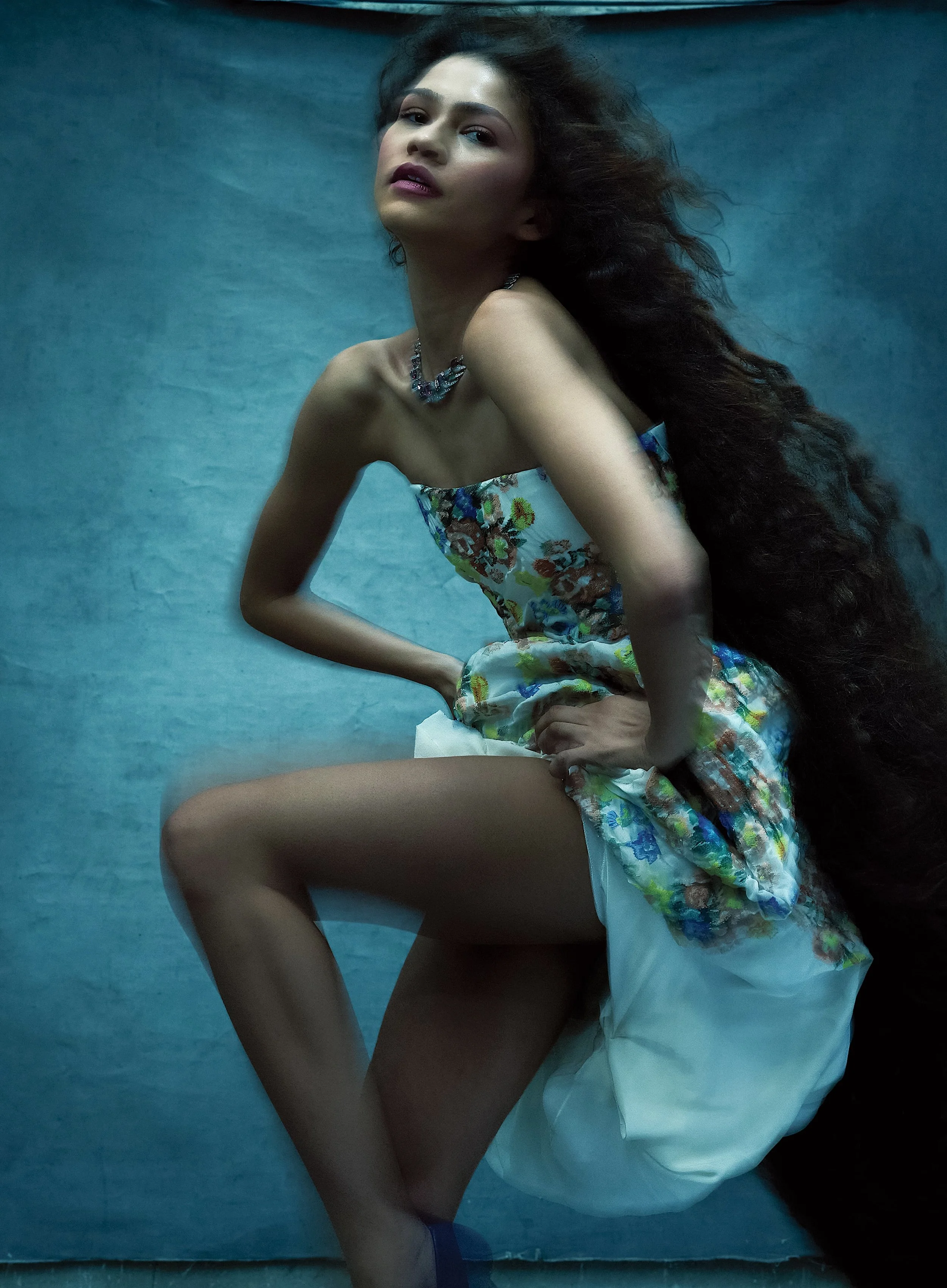 In this cover story Zendaya, whose ambassadorships include Louis Vuitton since spring 2023, Valentino until spring 2023, Bulgari, and Lancôme, is styled in couture elegance by regular stylist Law Roach.