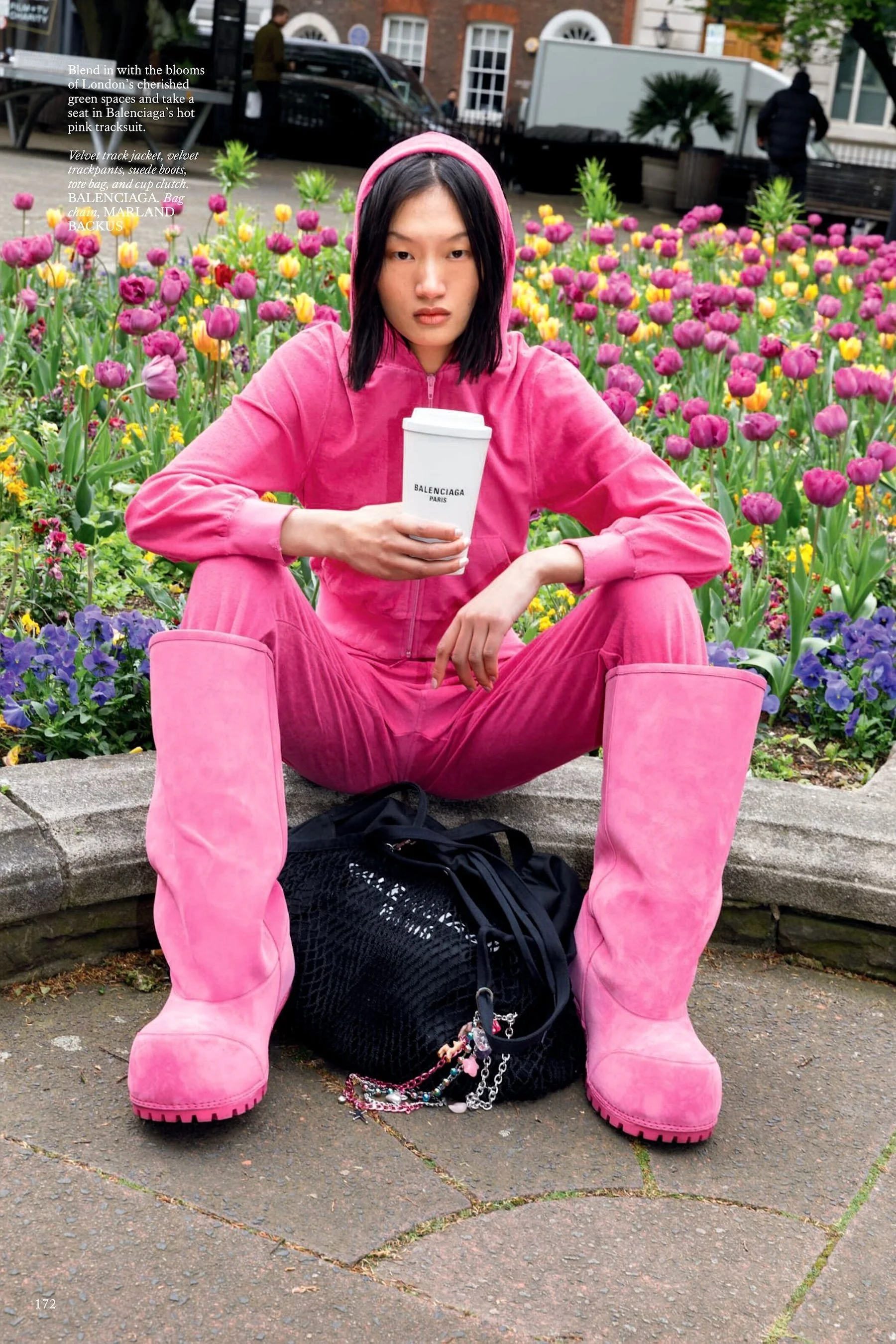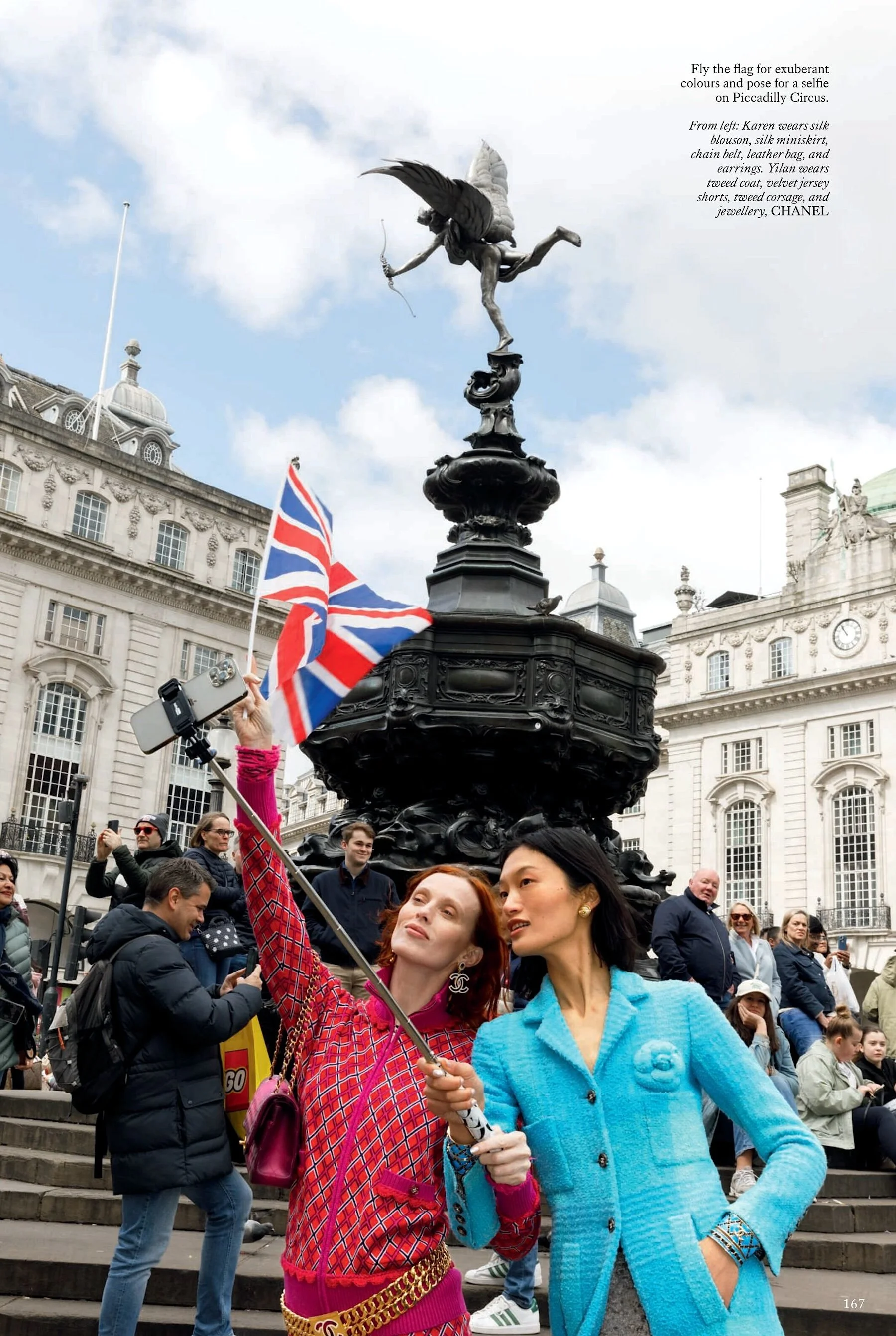 /Models Karen Elson and Yilan Hua send a fashion postcard from London in ‘Wish You Were Here’. Jeanie Annan-Lewin styles the duo in fashion pops colors from Balenciaga, Bottega Veneta, Chanel, Dolce & Gabbana, Ermanno Scervino, Fendi, Gucci, Louis Vuitton, Max Mara, Miu Miu, Prada and more.