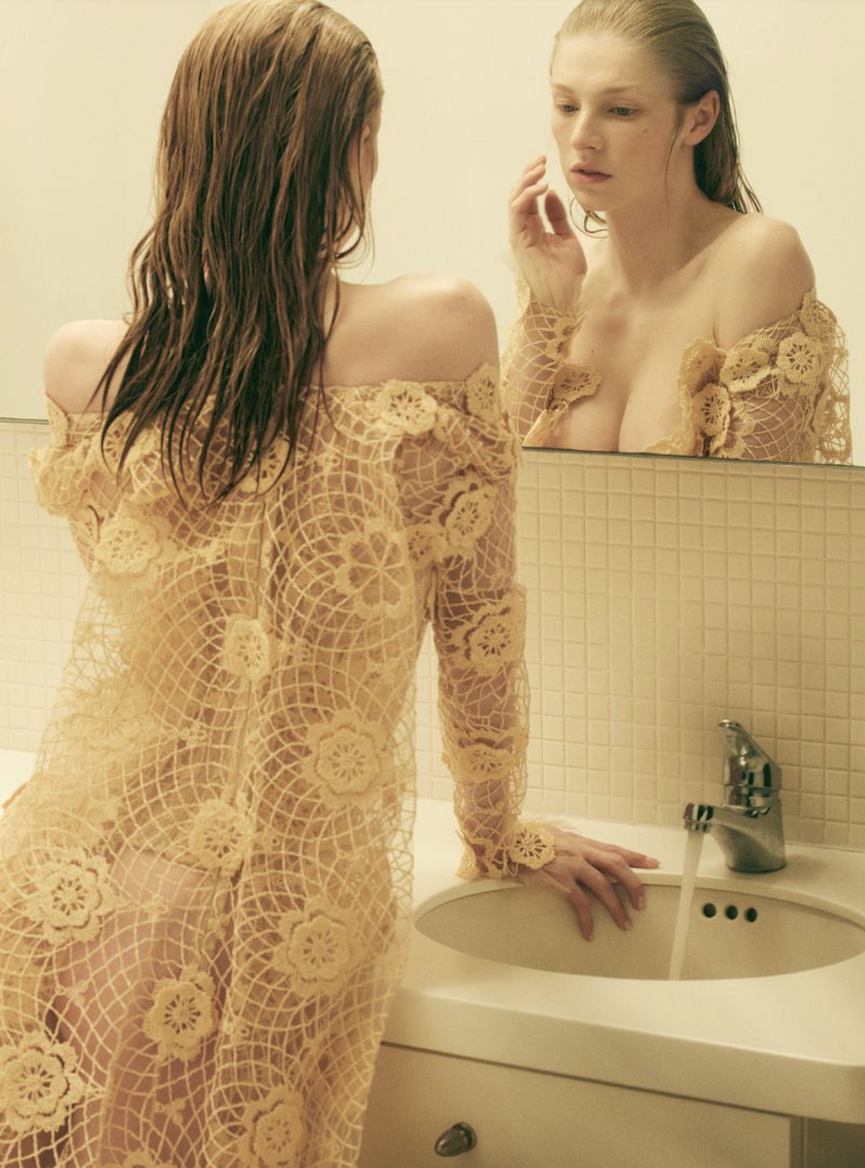 The fashion story attempts to reconcile the public and the private. Each image by photographer Ethan James Green [IG] reveals an aspect of performance while simultaneously concealing reality. Living under constant surveillance, being watched is internalized and self-imposed by the woman, role-played by Schafer. “To be a woman is to perform, even if only your reflection is watching.”
