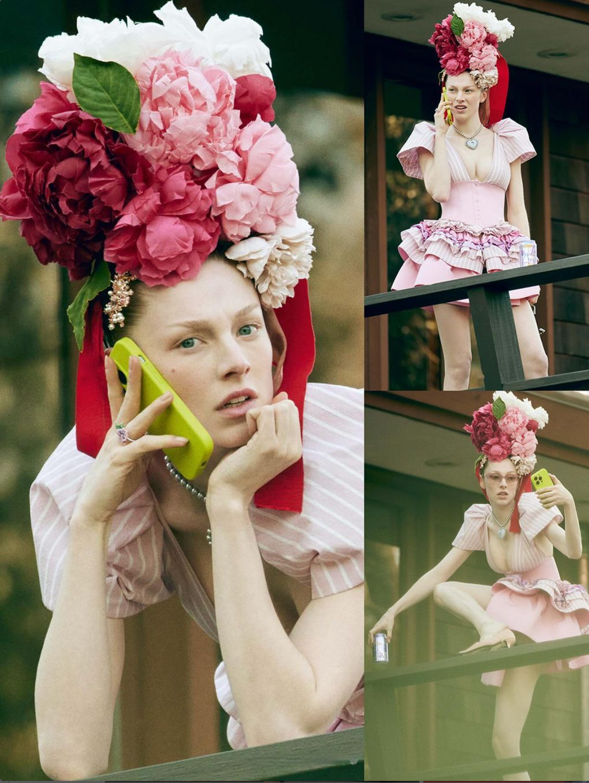 Hunter brews tea wearing Bottega Veneta above, while wearing a vintage showgirl headpiece. The actor does a Facetime fitting in Christopher John Rogers and Swarovski; gets ‘unready’ in Vivienne Westwood; drinks milk in Sportmax; gets unready in Vivienne Westwood; reads a novel in Isabel Marant; recycles in Isabel Marant; recycles in Prada; and bathes in YSL.