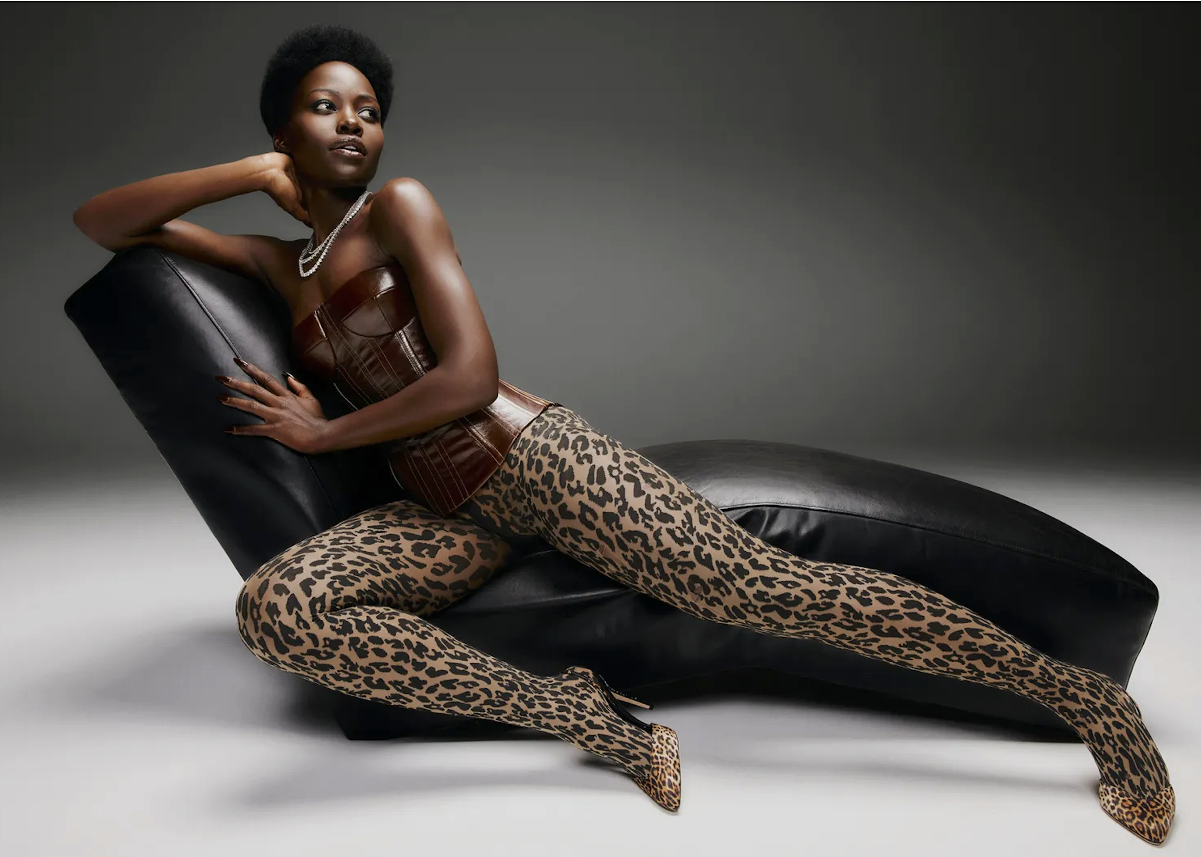 3] a leopard print PRISCAVera dress with a scarf-effect, plunging neckline; and 4] a Norma Kamali leopard print catsuit worn with De Beers diamonds. Nyong’o became a DeBeers ambassador in 2022.