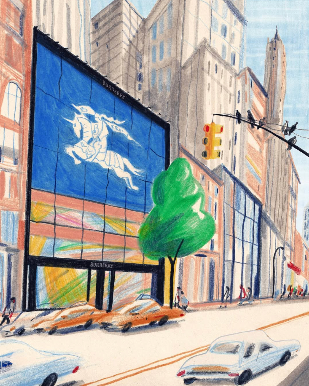 Burberry turned to Wiltshire, UK artist Liubov Edwards [IG] for an illustration of the mid-October reopening of the Burberry flagship store on 57th street in Manhattan.