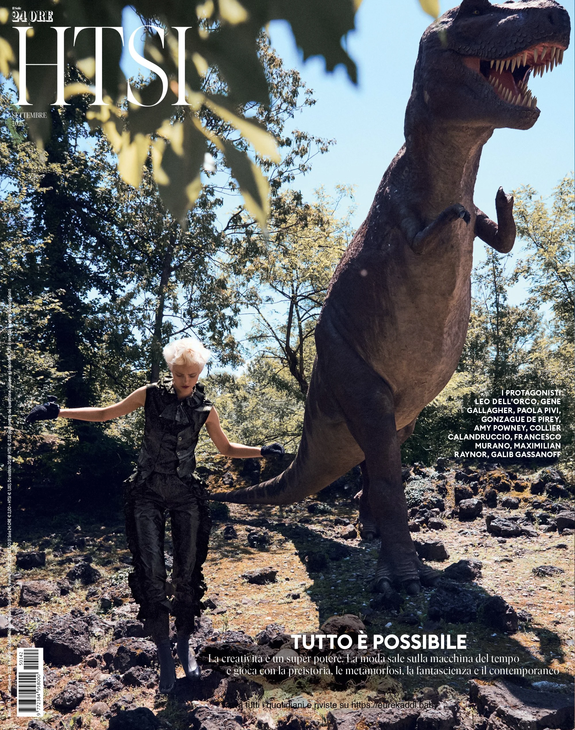 In this fashion story featuring model Maaike Klaasen, we set off for ‘Parco della Preistoria’ [IG], a trip back in time to discover dinosaurs, with the park located only 20km from Milan. Stéphane Gaudrie styles the woman in black in images by Stefano Galuzzi [IG], for the September 2025 issue of HTSI Italia. / Hair by Simone Prusso; makeup by Tanja Friscic