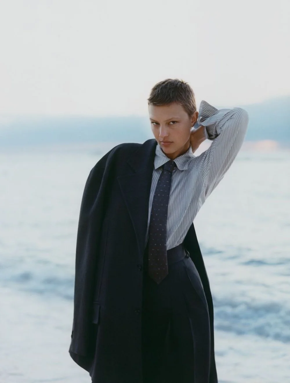 The buzz-cut model Ralph does business class, styled by Verity Parker in masculine suiting, crisp shirts and a tie for images by Ina Levy [IG]. Brands include Bally, Bottega Howell, Celine Homme, Hermès, Giorgio Armani, Loewe, Loro Piana, Margaret Howell, The Frankie Shop, Saint Laurent by Anthony Vaccarello, Tod’s, Wales Bonner and more.