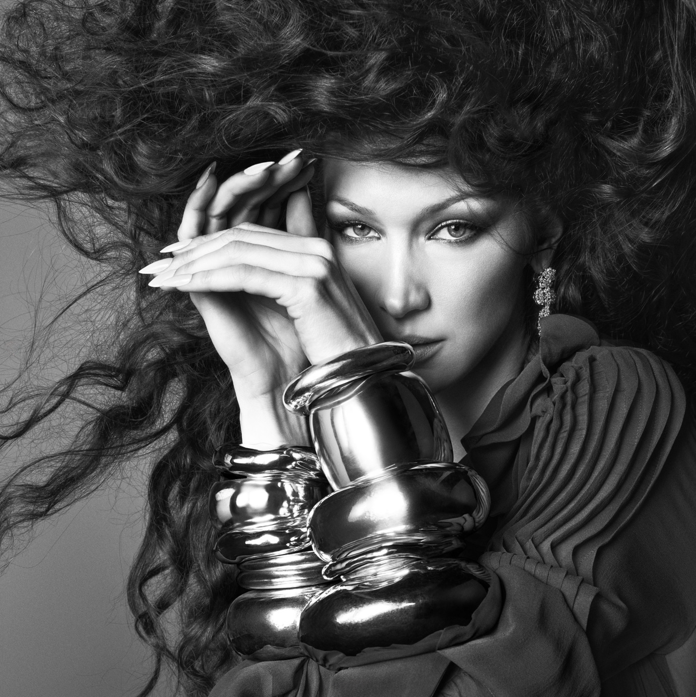 In her British Vogue cover interview and fashion shoot, Bella is styled by IB Kamara in chain-mail from Etro and Balmain and embellished tulle from Dolce & Gabbana. Her silk crepe cover dress is Saint Laurent by Anthony Vaccarello. High jewelry comes from Chopard — for whom Bella is a global ambassador. Earrings and super bangles are from Alexis Bittar.