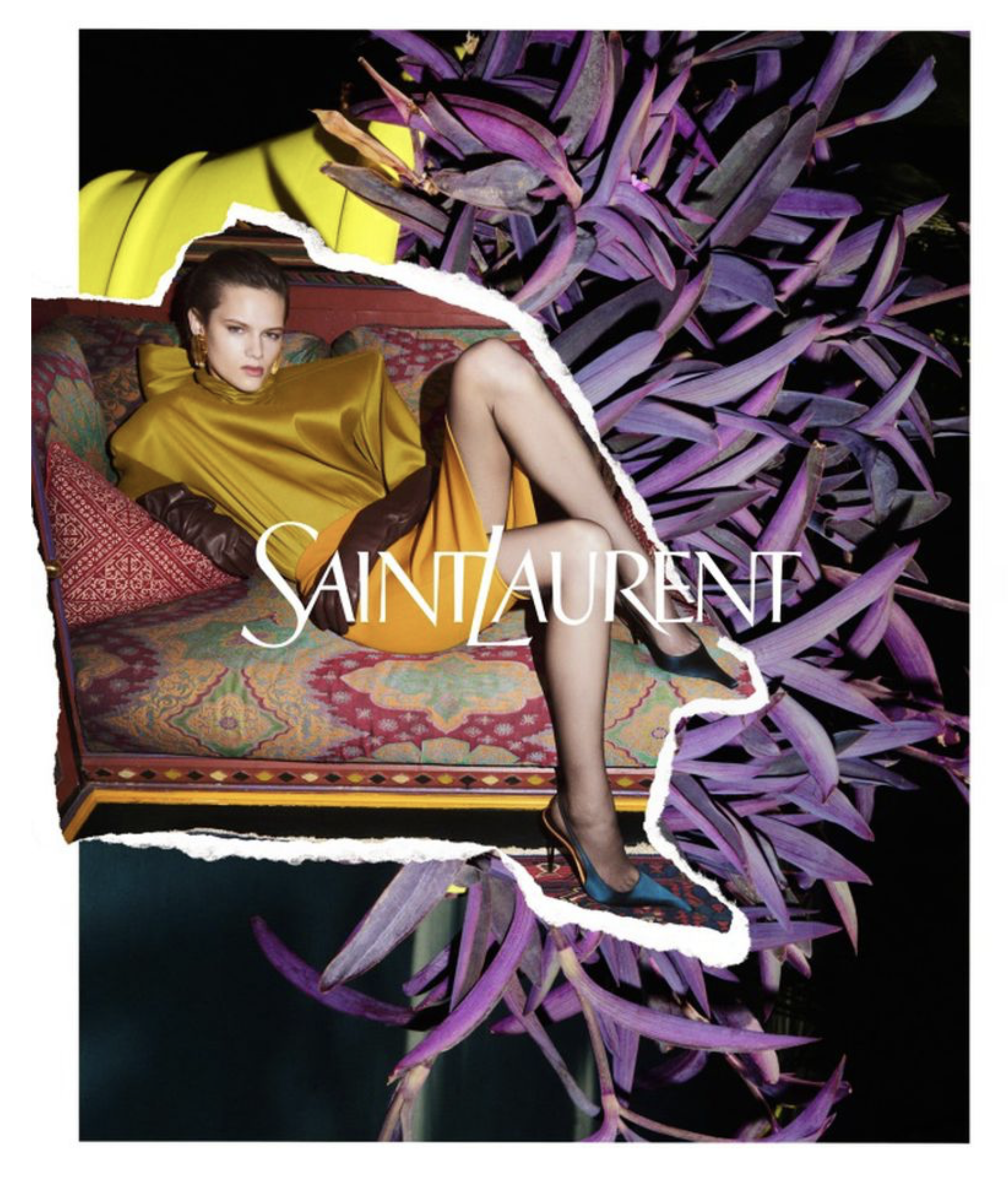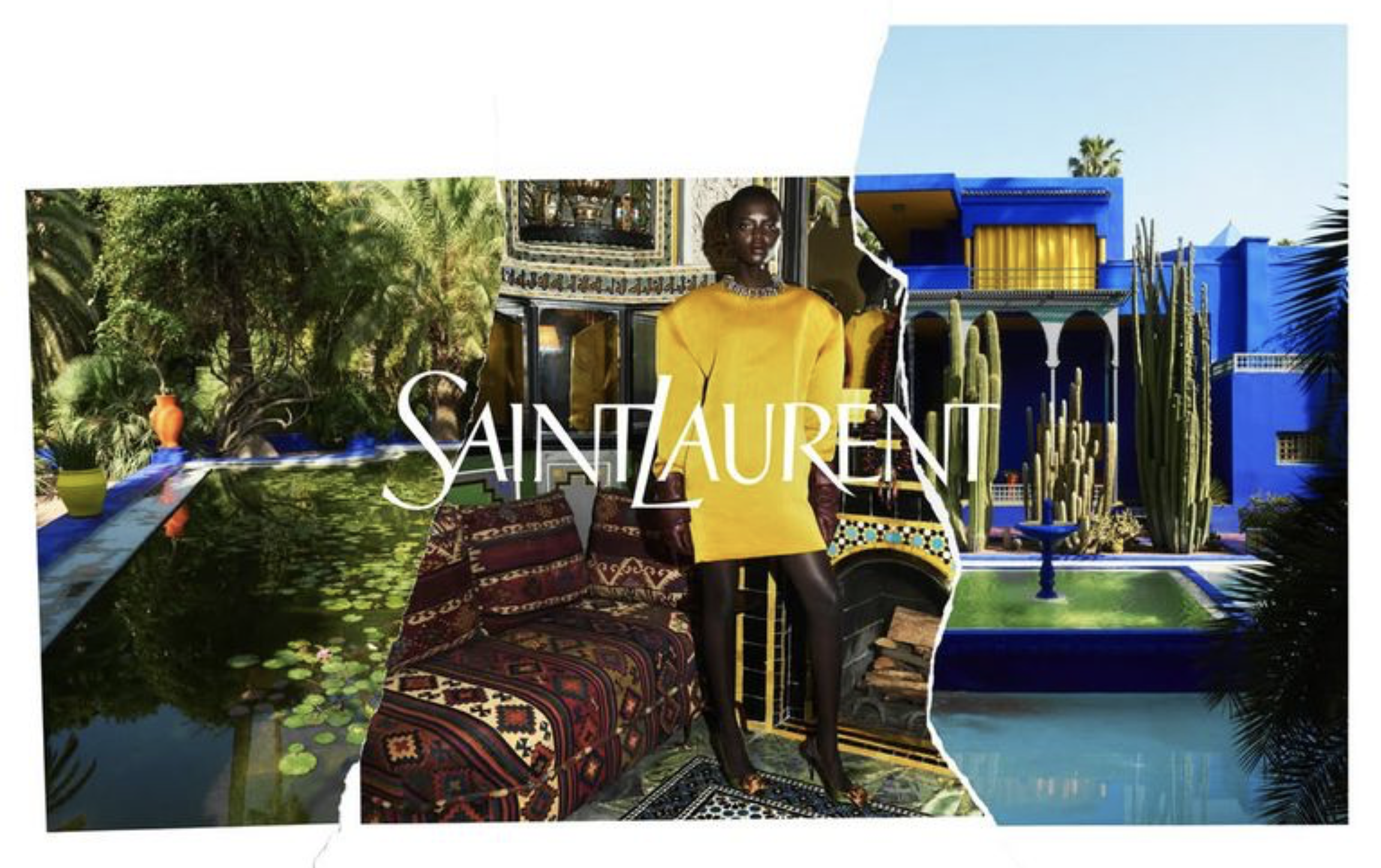 Collage effects are unusually effective in the campaign, acting as a metaphor for the French-Moroccan cultural design fusion that has fueled French design for decades. The synergy between the two cultures is a foundational element in the careers of Yves Saint Laurent and other designers in fashion and interior spaces.