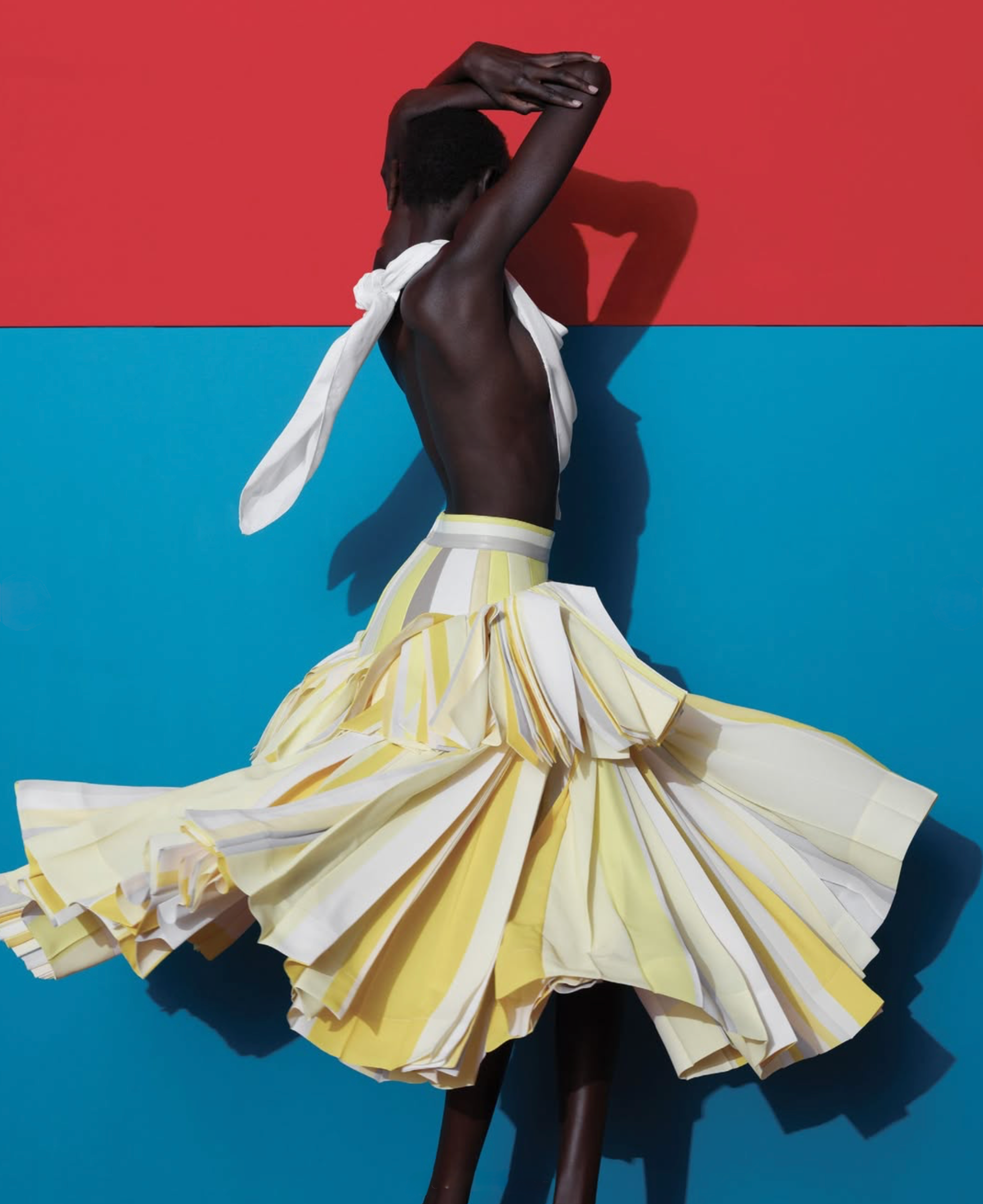 Viviane Sassen [IG] captures model Rejoice Chuol showing off more players in the story including Bach Mai, Gucci, Issey Miyake, Jacquemus, Lacoste, Loro Piana, Louis Vuitton, Prada, Stella McCartney, Tibi, Tod’s, Tory Burch, Ulla Johnson and more. / Hair by Cim Mahony; makeup by Mathias van Hooff; set design by Gemma Tickle