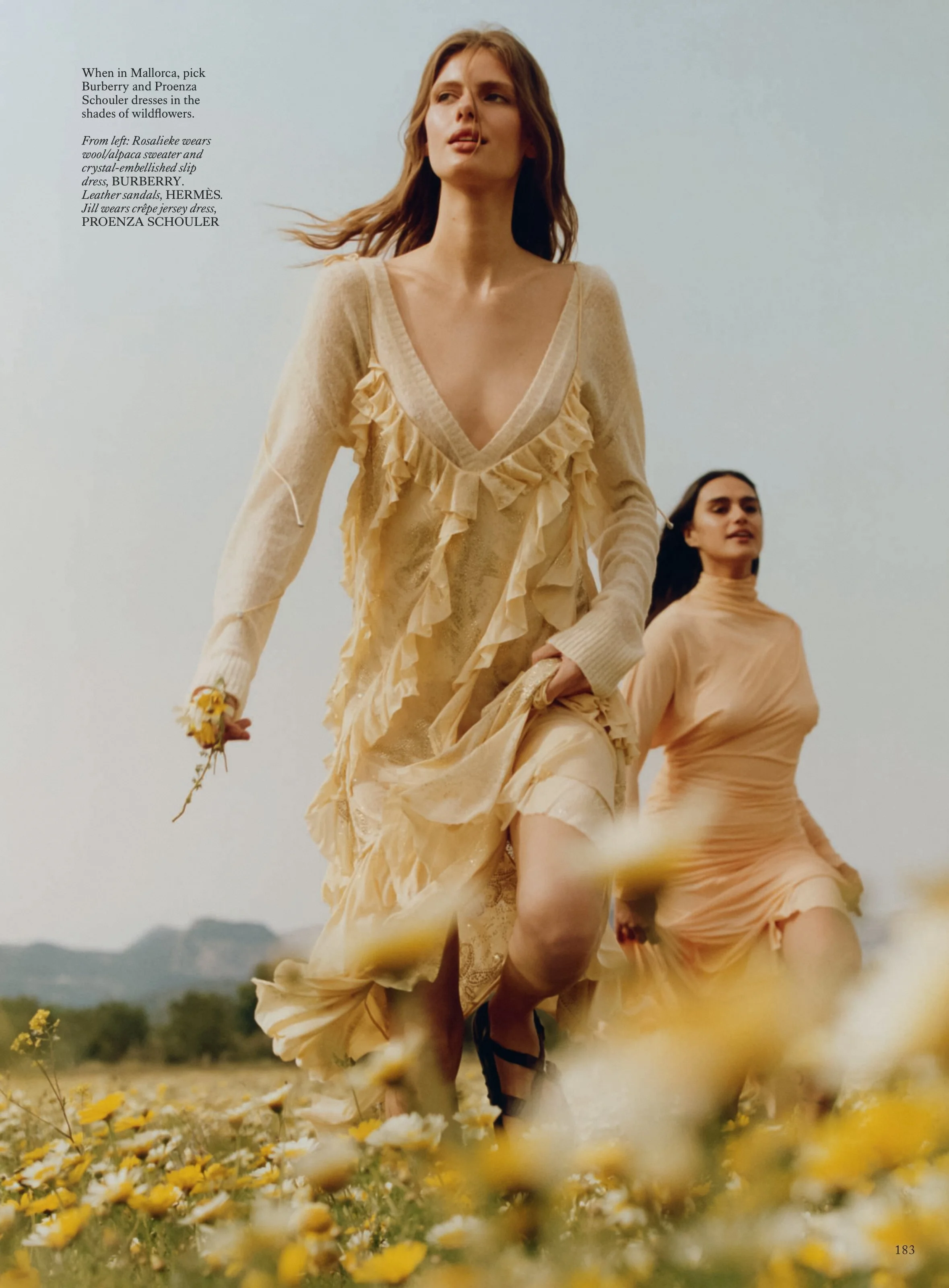 /Models Jill Kortleve and Rosalieke Fuchs commune with nature in ‘Pure Shores’. Clare Richardson styles the two beauties in Bottega Veneta, Burberry, Chloé, Dolce & Gabbana, Ferragamo, Hermes, Loro Piana, Miu Miu, Proenza Schouler, Tom Ford and a raffia hat from Polo Ralph Lauren.