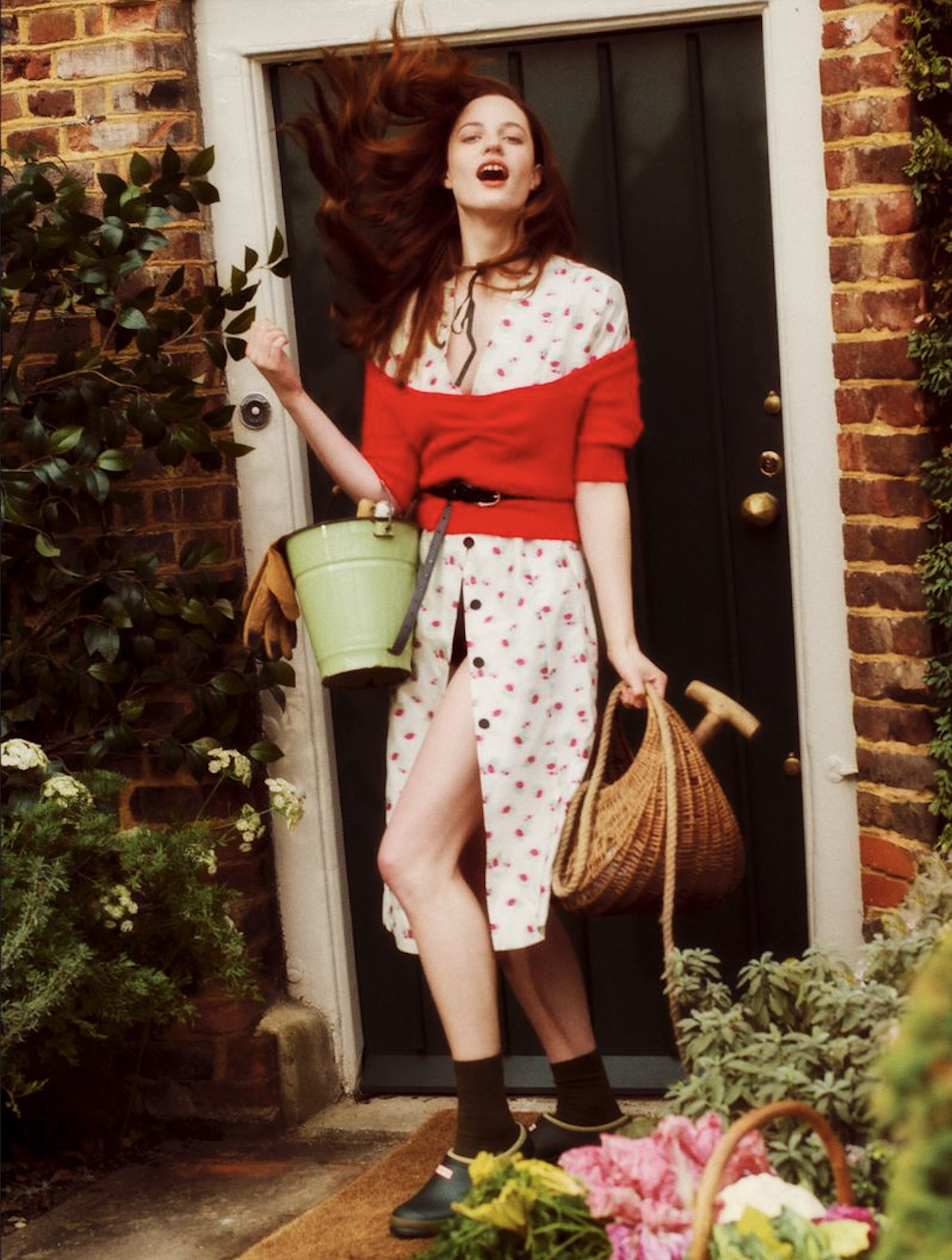 Model Julia Banas is styled by Aurelia Donaldson in ‘Earthly Delights’, a fashion story centered on the pleasures of gardening. Photographer Stef Galea [IG] showcases the beauty of pitchforks and wheelbarrows for ELLE UK [IG] April 2024./ Hair by Sharon Robinson; makeup by Martina Lattanzi