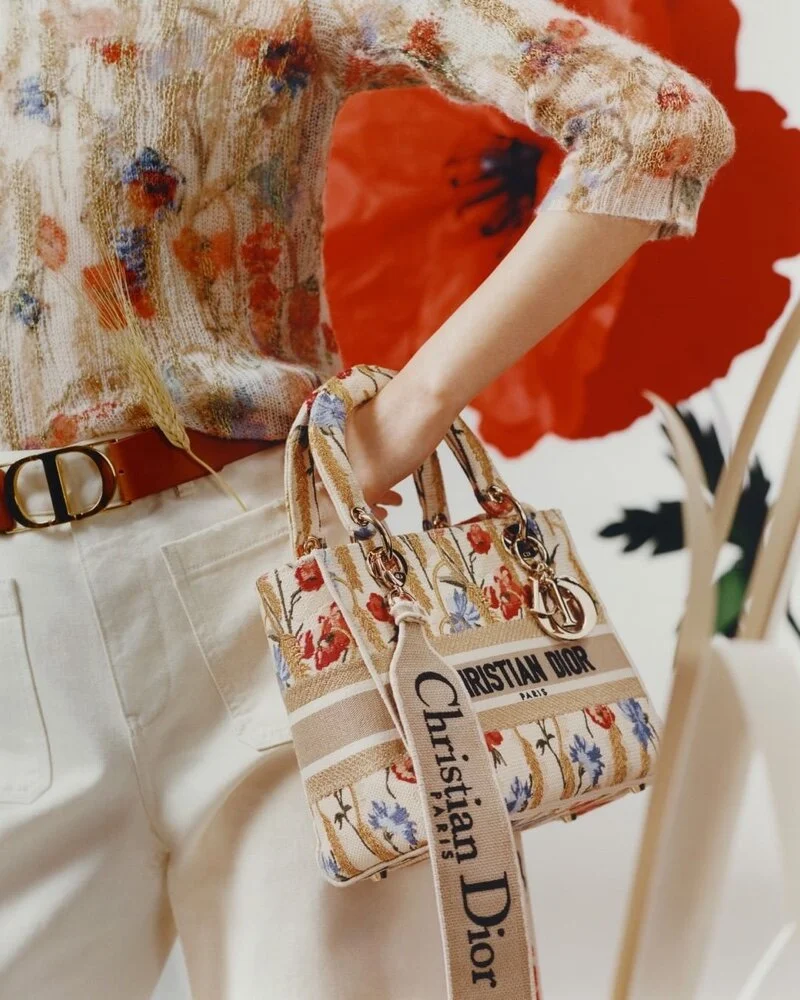 An elegant floral motif, baptized "Dior Hibiscus", embellishes a series of ready-to-wear pieces, bags, jewelry and accessories. These delicate floral designs inspired by the Hibiscus rosa-sinensis, or "China rose", are displayed alongside ears of wheat on lightly pleated dresses, airy skirts and flowing tops, also infusing the iconic Dior Book Tote and Lady Dior with a bucolic spirit.
