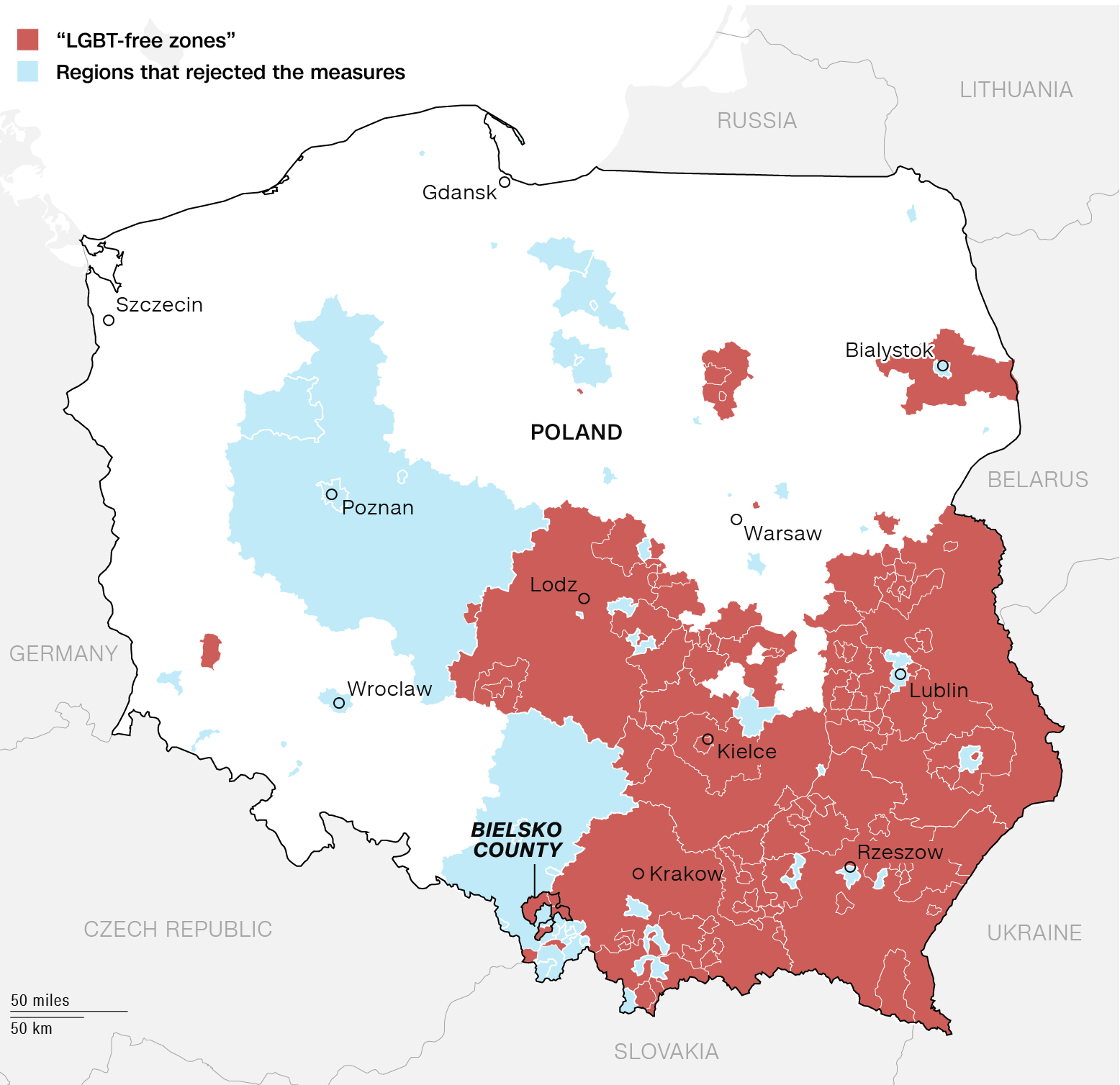 Our NATO ally and member of the EU is now a country where a third of the country exists as a “red zone” or region that is ‘LGBT-free’, based on local elections referendums. The date of this in-depth CNN investigation is October 2020, and the situation has only worsened in three years.