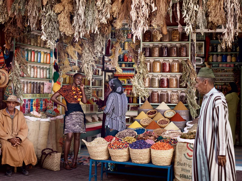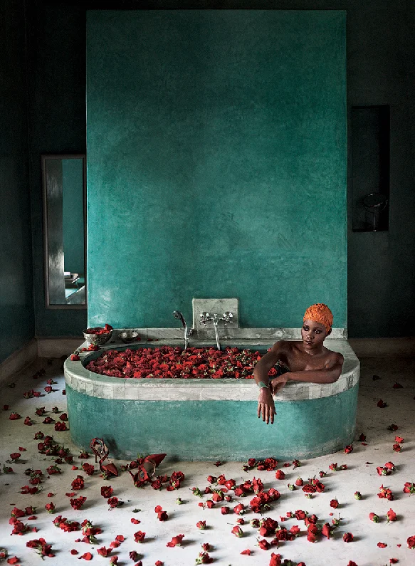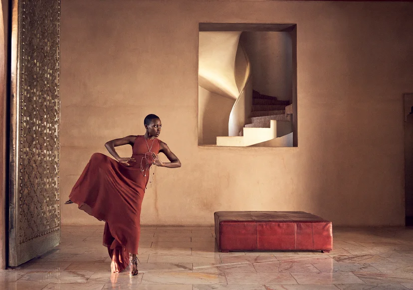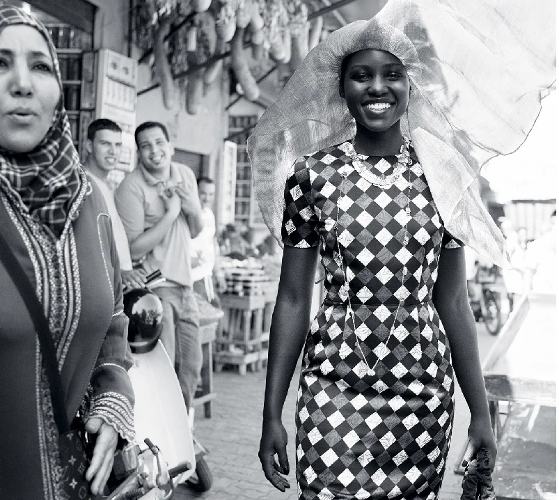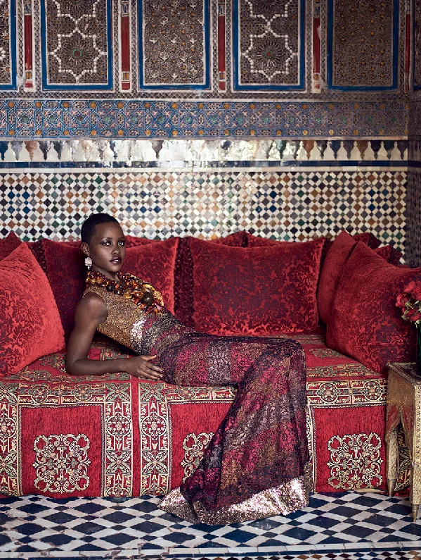 We find Lupita at the oasis sanctuary Ksar Char-Bagh, a “castle-like fort in the middle of the Palmeraie” with views of the Atlas Mountains in the distance. Commenting on her role as Lancôme’s newest brand ambassadors, who currently include Julia Roberts, Kate Winslet, and Penélope Cruz, Lupita thrills to the concept that her sisters “are very different, unique women—it’s not about conforming to an already established idea of what is beautiful, and I like that.”
