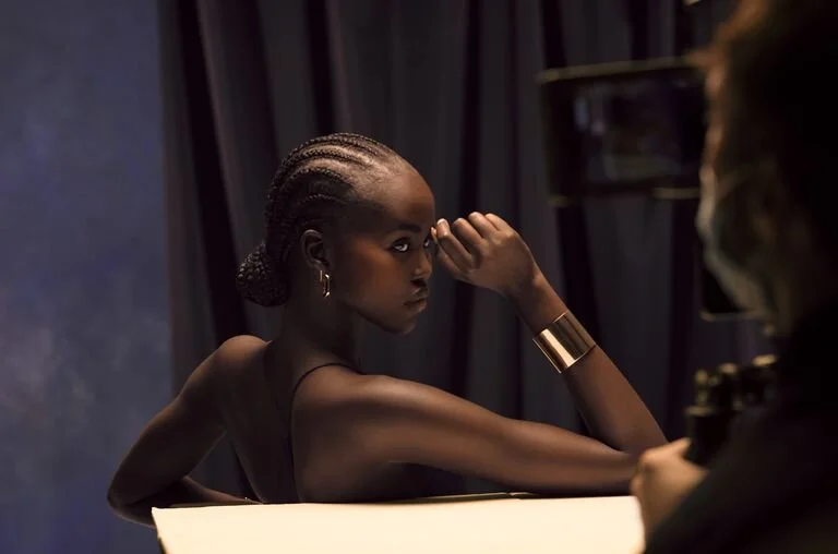 Adut Akech on the set for Estee Lauder.