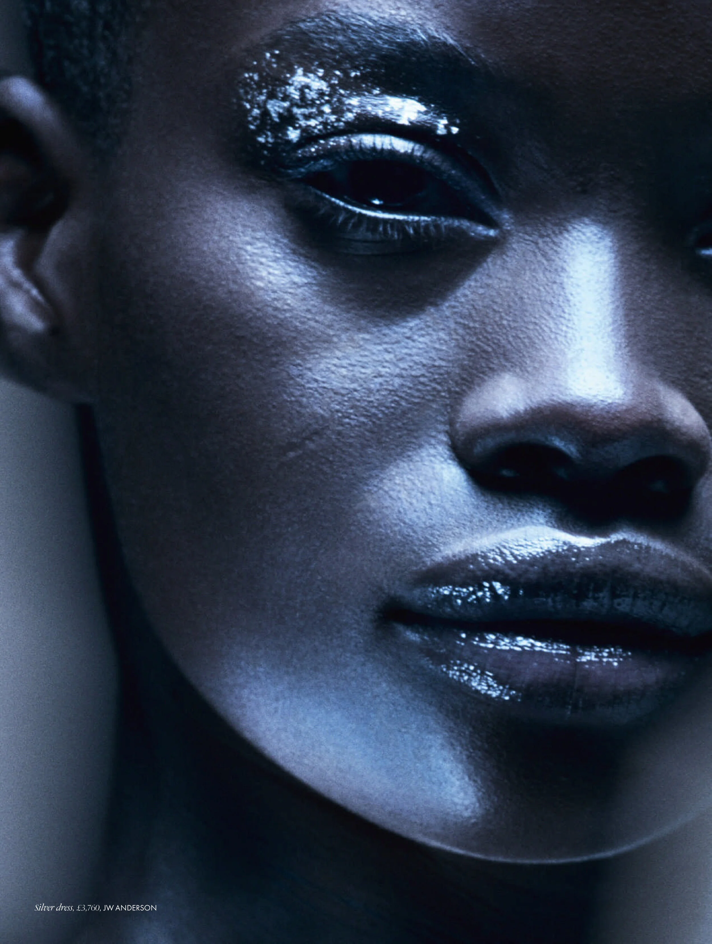 Model Fatou Jobe was born in the Bronx, NY then moved to Gambia, Africa. before returning to the US at age 11. Charles Varenne styles Jobe in metallic surface fabrics in luxe party dresses from Alberta Ferretti, Balenciaga, Georgio Armani, Marc Jacobs, Miu Miu, Oscar de la Renta, Versace and more.Photographer Tom Schirmacher (IG) captures ‘Iron Maiden’ for ELLE UK October 2020./ Hair by Romina Manenti; makeup by Virginia Young