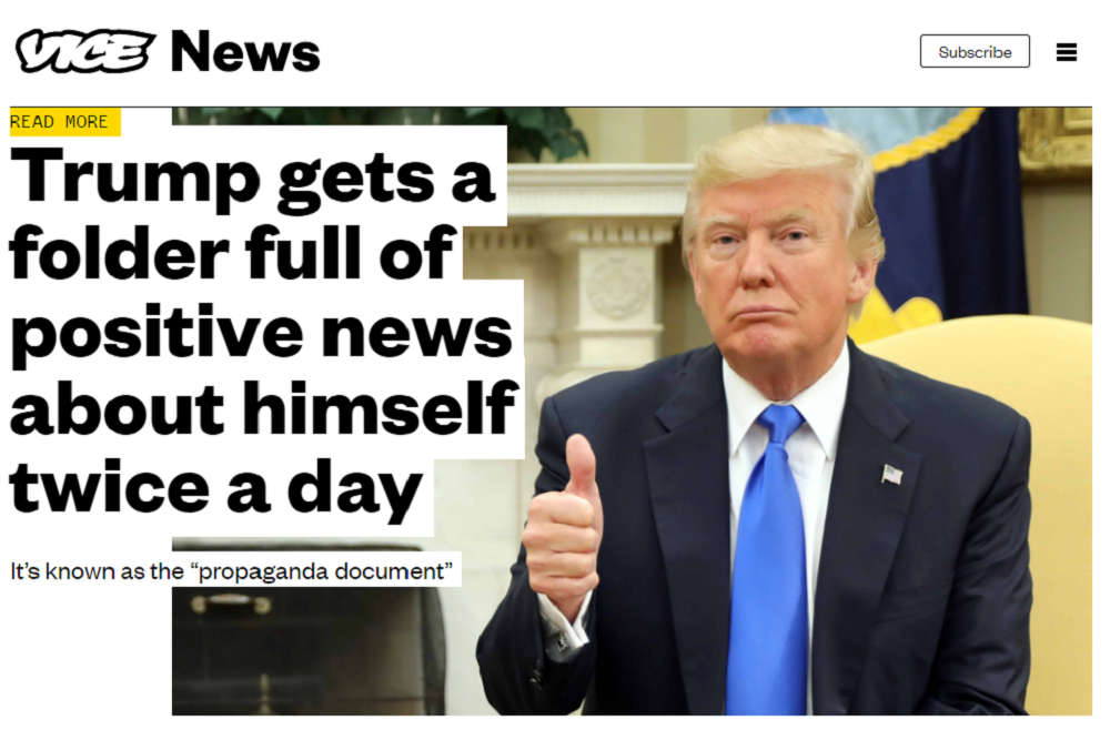 Vice News reports that twice daily since Trump was inaugurated, a special folder is prepared for the president. The first document is presented as a feel-good acknowledgement of Trump's greatness at about 9:30 a.m. and the afternoon edition, around 4:30 p.m. Former Chief of Staff Reince Priebus and former Press Secretary Sean Spicer both sought the privilege of delivering the precious propaganda 20-to-25-page packet to President Trump personally, White House sources say.