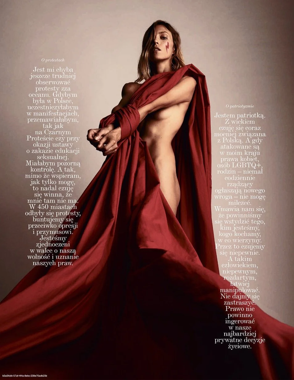 In December 2020 issues of most global Vogues, Anja Rubik issued a call to action around the global erosion of abortion rights and an increase in anti-LGBTQIA+legislation.