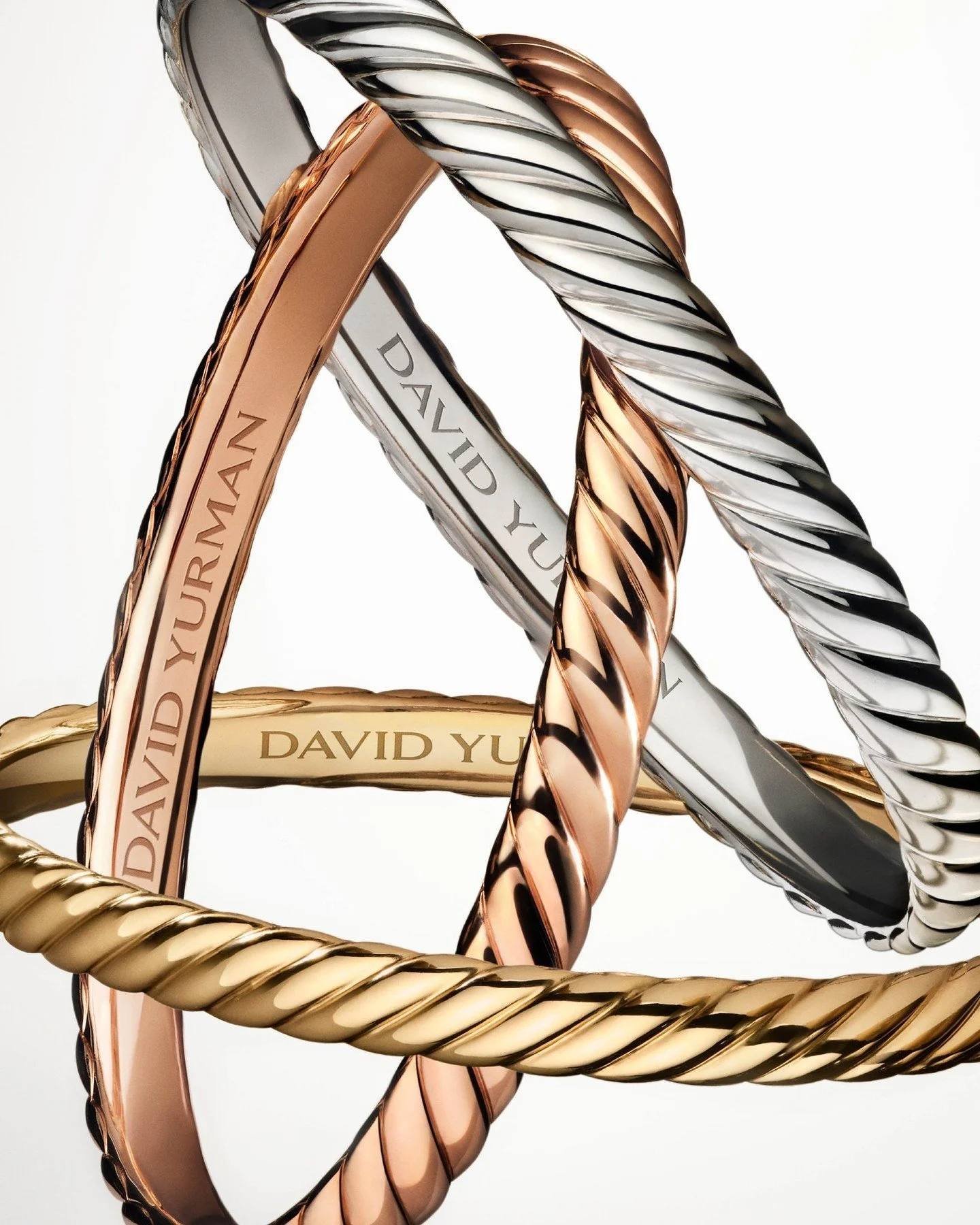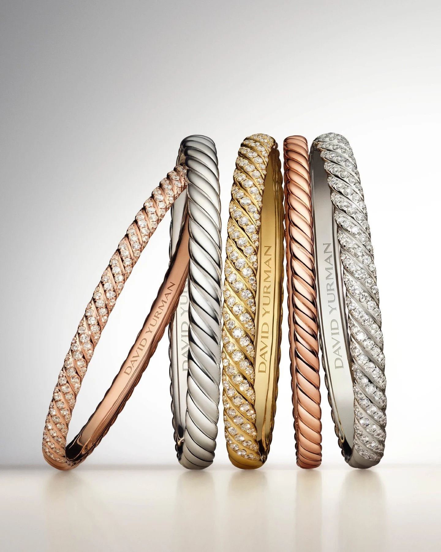 Her David Yurman Sculpted Cable collection includes sleek twisted bangles, hoop earrings, and rings in yellow, rose, and white gold, with and without hand-set pavé diamonds.