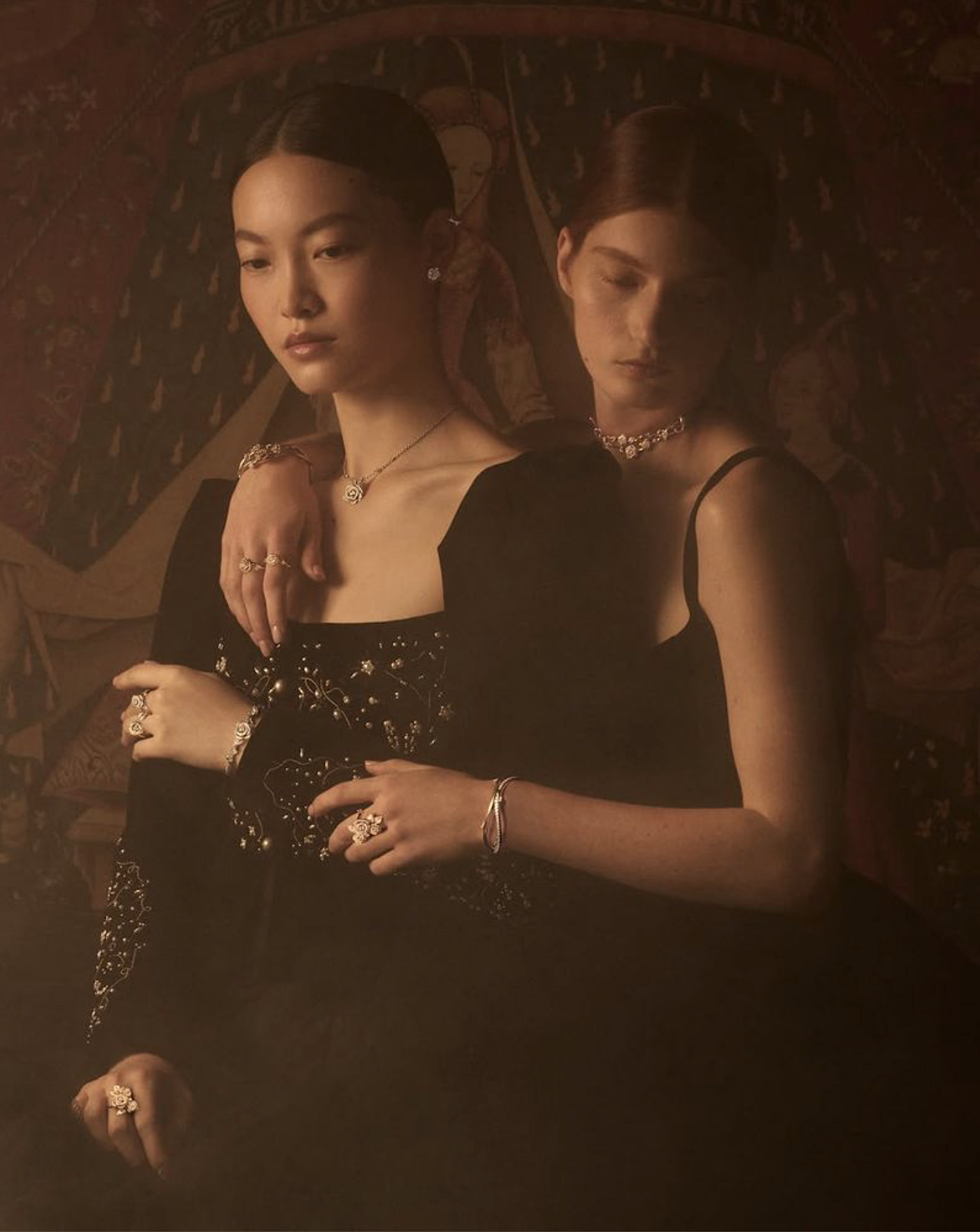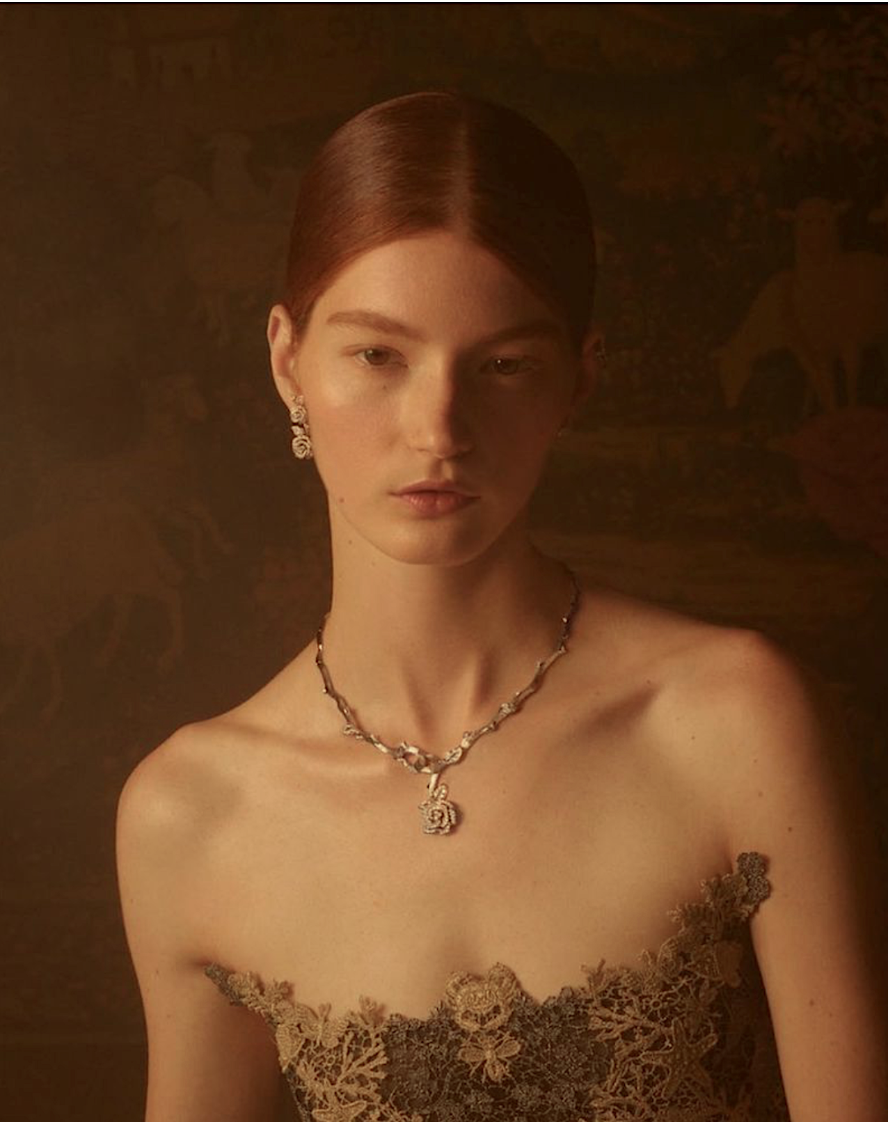 Frequent Dior photographer Elina Kechicheva's [IG] ‘Celestial Poetry’ images capture the quiet allure of Rennaisance paintings in her signature highlights of the new ‘La Rose Dior’ collection. The sparkling designs offer elegant versatility with a choker accentuated by a black velvet ribbon, and the Bois de Rose creations dressed, by turns, in rose or yellow gold, entirely paved in diamonds.