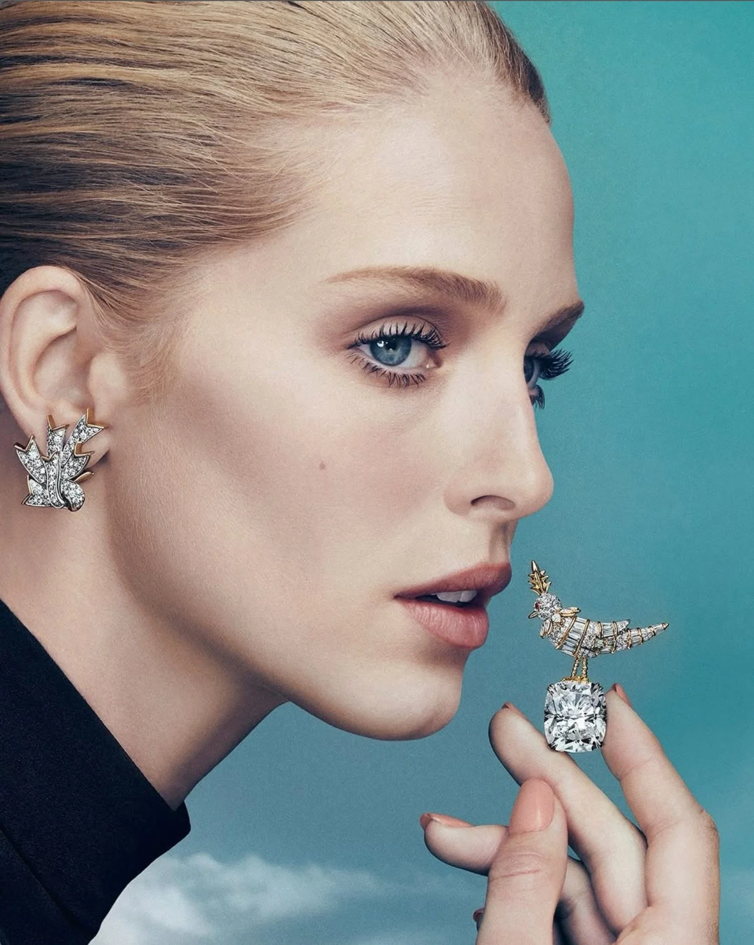 /Fresh off the January 2025 introduction of the Jean Schlumberger by Tiffany Bird on a Flying Tourbillon watch and the Jean Schlumberger Bird on a Rock Tsavorite Watch at the sixth edition LVMH Watch Week in New York and Paris, we turn to the new Tiffany & Co ad campaign featuring top model Abby Champion. Katie Burnett styles Champion in images by Carlijn Jacobs [IG]./ Hair by Jawara; makeup by Sam Visser