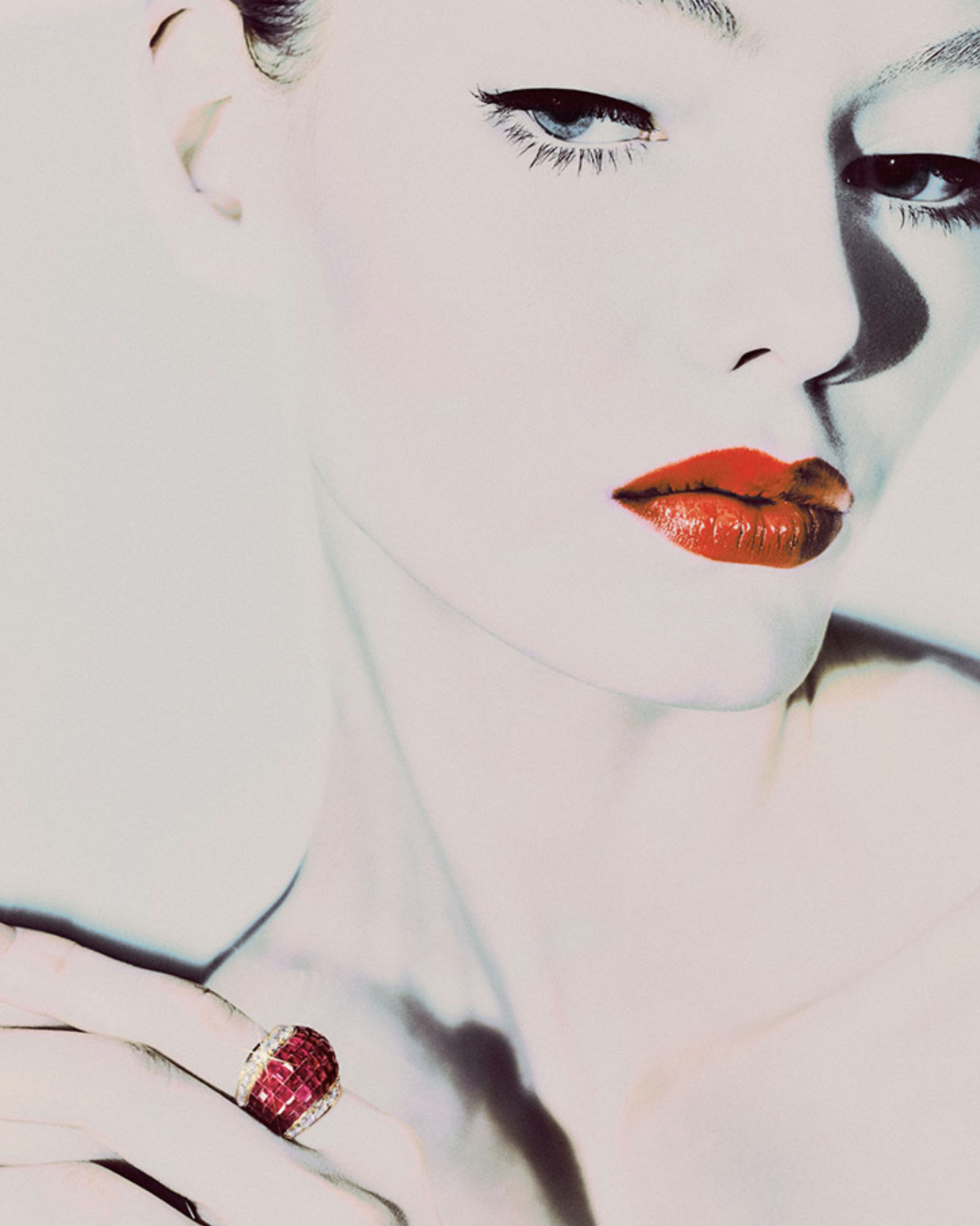 The latest design chapter was, previewed on Dec. 9 at the Palace Hotel St. Moritz. It comprises three monochrome series or design stories: [1] blue, with sapphires and diamonds paired with white gold; [2] green, with tsavorites and diamonds paired with yellow gold, and [3] red, with rubies and diamonds paired with rose gold.