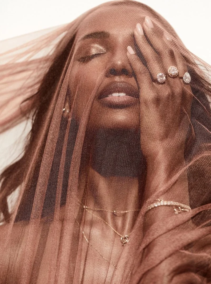 /Jasmine Tookes poses in fall 2021 designs from Logan Hollowell Jewelry, lensed by Adam Franzino IG]. Logan Hollowell is handcrafted in Los Angeles using recycled gold, conflict-free diamonds and gemstones from around the world.