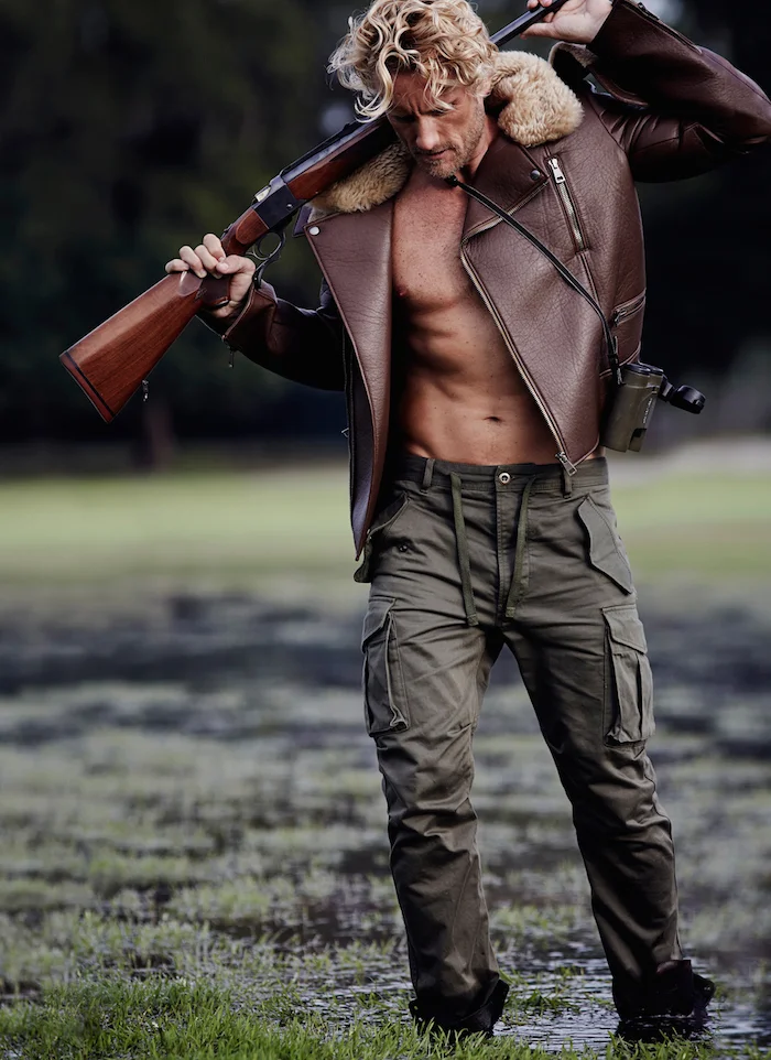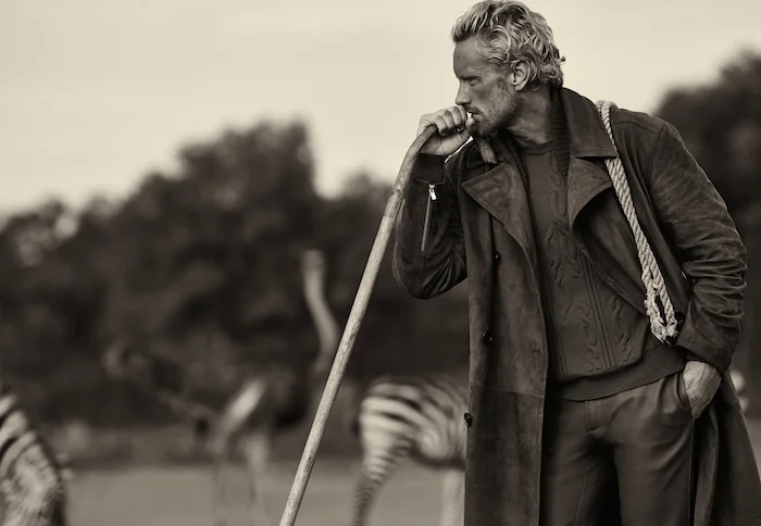 /Out Magazine shares a rich new editorial focusing on photographer Peter Beard and animal conservation. Shot at an exotic animal reserve in Northern Florida, model Kevin Rice plays the rugged Beard, communing with giraffes, zebras, and lemurs. Shot by Blair Getz Mezibov with styling by Grant Woolhead and grooming by Carolina Dali, the story is sexy and consciousness raising around animal conservation.