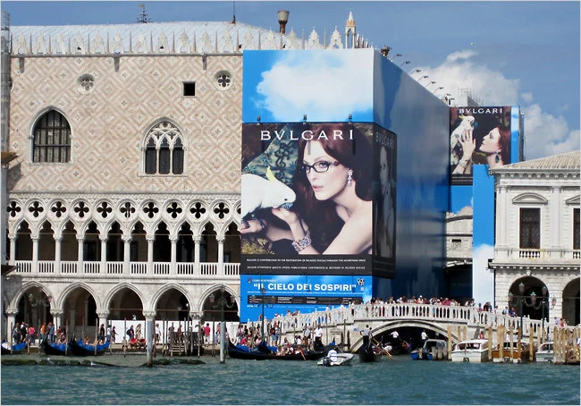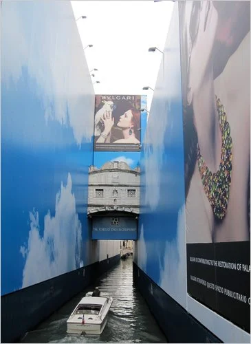 The New York Times visits the challenges of restoring Venice in a commercial world where corporate sponsorship of places and events involves not a quiet donation to preserving the planet but a typically visual announcement that can be seen for miles.