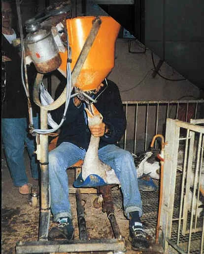 To deliver the foie gras delicacy on human dinner plates, birds are force-fed swollen grain, usually maize, over an 18-day period, with a long metal tube down their throats. About 4 pounds of grain mixed with fat are pumped into the birds’ stomachs two or three times daily.