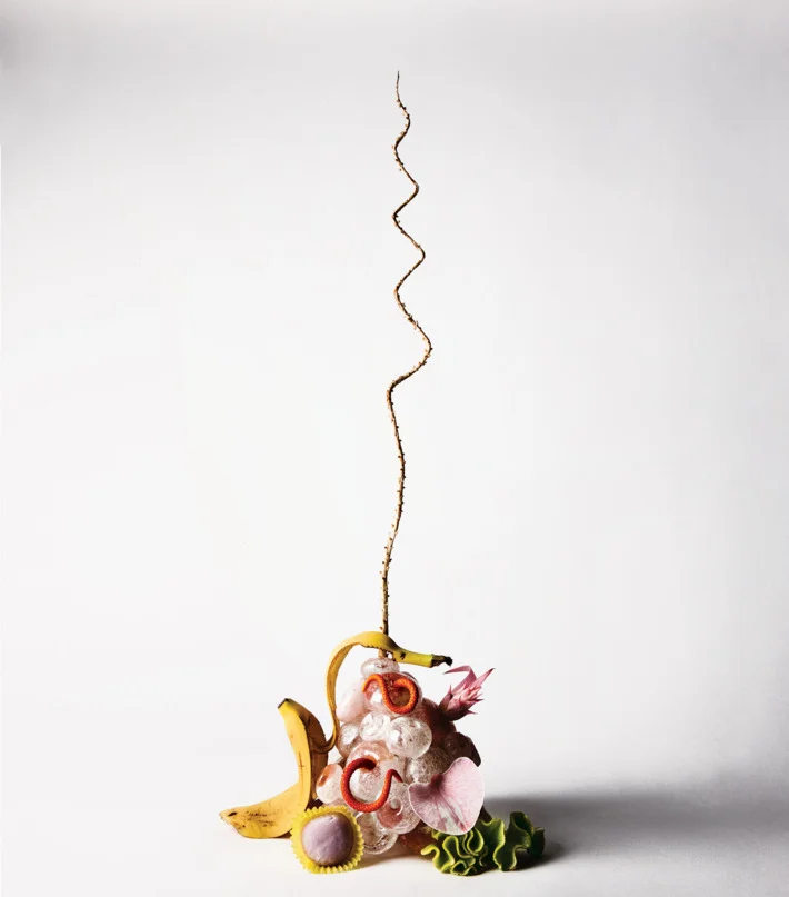 Freakebana (pronounced free-ke-ba-na) is what I am calling it. The turnt cousin of Ikebana, Freakebana is the art of arranging whatever-the-hell, in a way that nods at the traditional Japanese art form, but subs out years of study for a naive, new-wave naturalism. In Freakebana, the components are more likely foraged from the corner deli, as opposed to a Shinto garden. Good Freakebana mixes sparse, eccentric elements for maximum surprise. Say: pink carnations, cubes of jello, an air plant, and Maldon salt crystals.