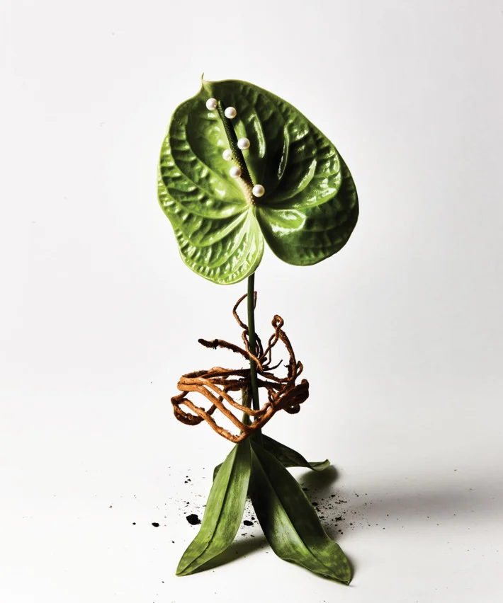 Anthurium, orchid roots, with Tiffany & Co. Tiffany Signature cultured Akoya pearl earrings, $1,400 per pair at tiffany.com. Photo: Bobby Doherty/New York Magazine