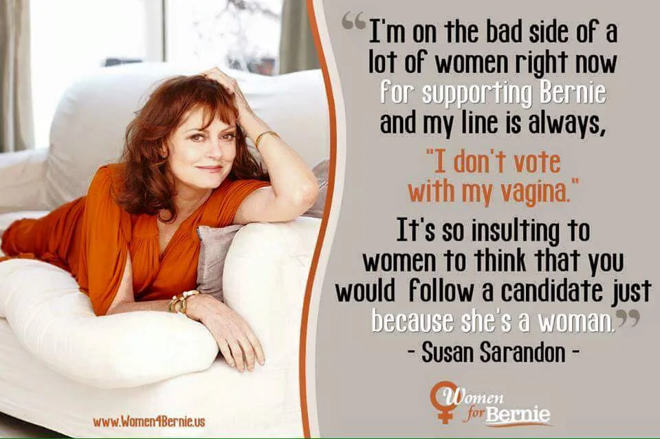 /Thank goodness Clio wrote this articulate response to Bernie Sanders supporter and spokes woman Susan Sarandon. Clio is demanding a public apology and I agree. Susan Sarandon is a UN ambassador and supposedly stands for female empowerment around the world. Instead, she reduces anyone who supports Hillary Clinton to a brainless vagina. Her sexism stings just as deeply as the worst insults from the Bernie Bros. As my close friends know, this meme was nothing less than a dagger in my heart.