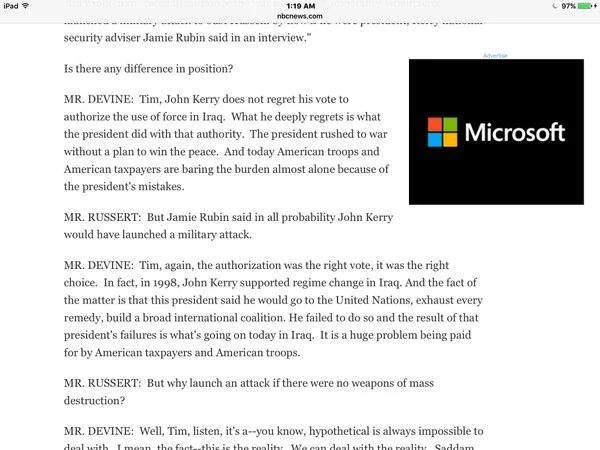 "Tim, again, the authorization was the right vote, it was the right choice. In fact, in 1998, John Kerry supported regime change in Iraq. And the fact of the matter is that this president said he would go to the United Nations, exhaust every remedy, build a broad international coalition. He failed to do so and the result of that president's failures is what's going on today in Iraq. It is a huge problem being paid for by American taxpayers and American troops."