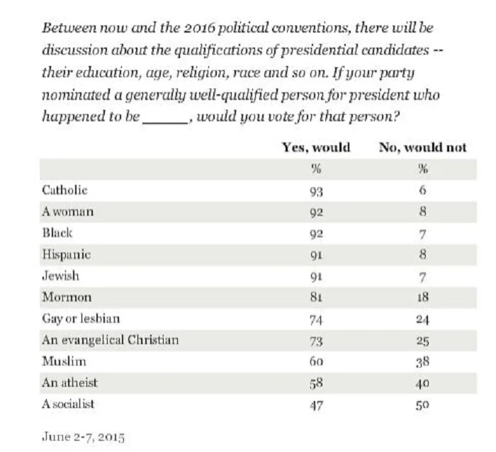 Being socialist lost to Catholic, a woman, Black, Hispanic, Jewish, Mormon, gay or lesbian, an evangelical Christian, Muslim, and atheist.