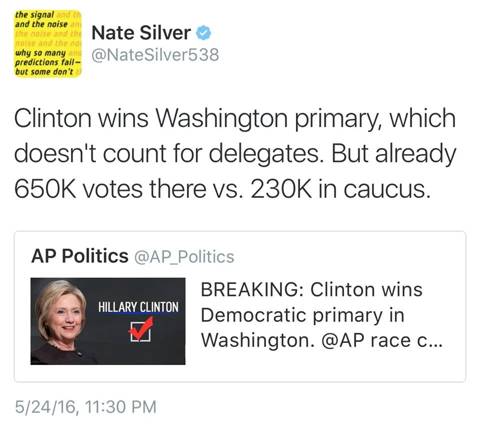 So Sanders is set to lose, but in a way that leaves him unscathed and therefore appearing very strong in the general. There was something similar with John Kasich. Maybe Sanders really would have survived all of the attacks from Clinton that would have come if he had been a bigger threat to win the nomination. But as it is, it’s just a question mark."