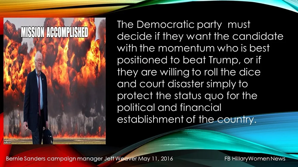 Chief Sanders surrogate Susan Sarandon is praying for a health emergency that derails Hillary Clinton's Democratic nomination. Campaign chairman Jeff Weaver says the superdelegates should overturn the popular vote in which Hillary leads Bernie by over 3 million votes -- and potentially close to 4 million in June. This Sanders tribe is a real democratic class act.