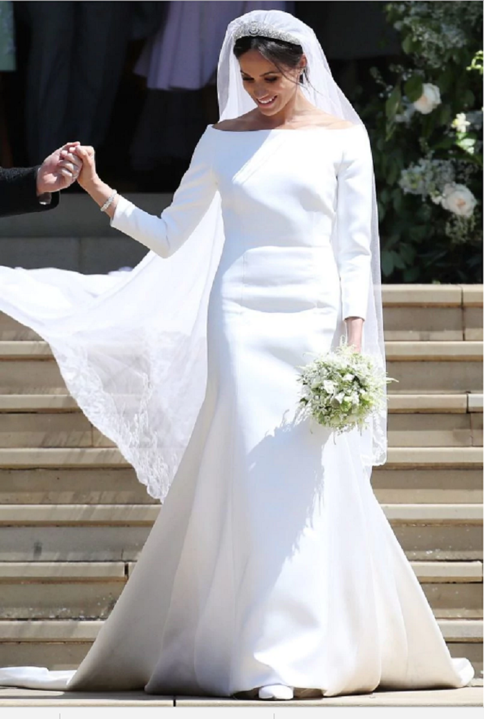 Markle's veil was considered by many to be a nod to Princess Diana's "epic train" at her 1981 wedding to Prince Charles. Five meters of delicate silk tulle embroidered with flowers representing the 53 countries of the British Commonwealth, Kensington Palace and her home state of California signified the weight of duty, tradition, multiculturalism, and the commitment that Harry and Meghan have already made to visiting young people throughout the Commonwealth.