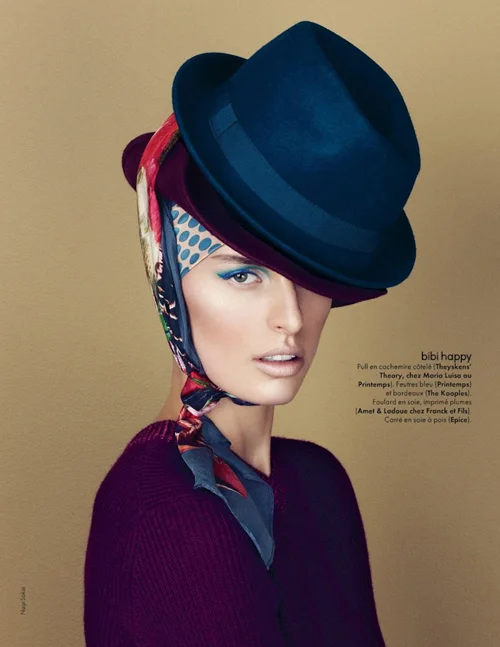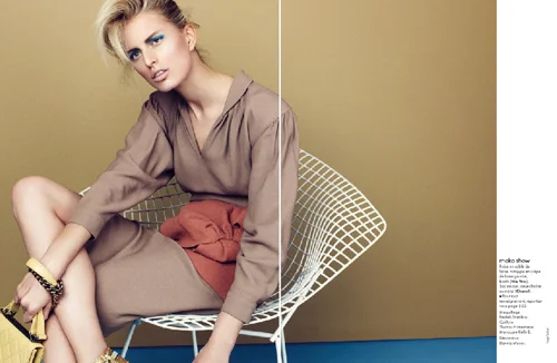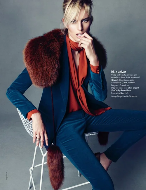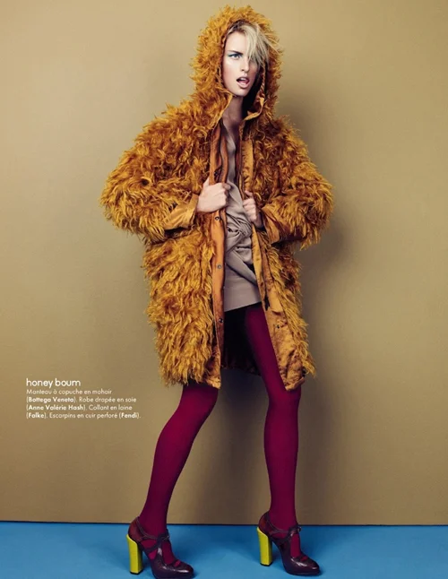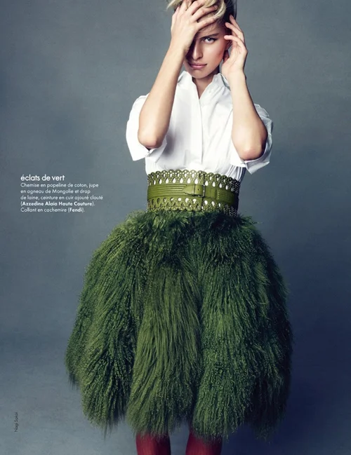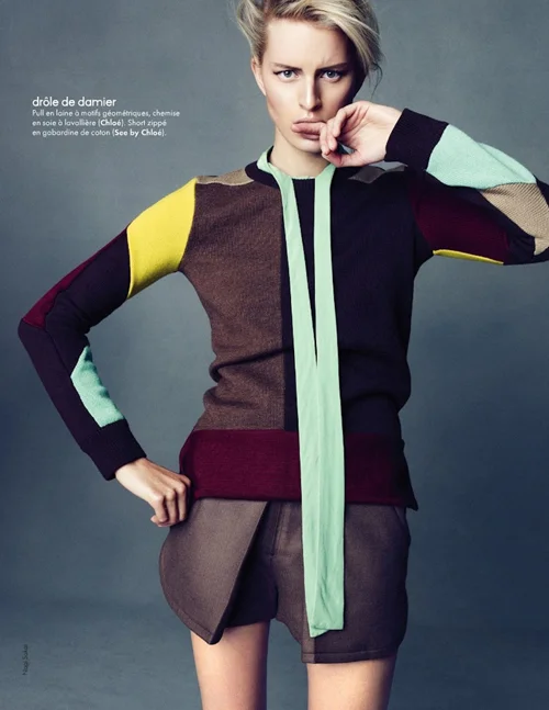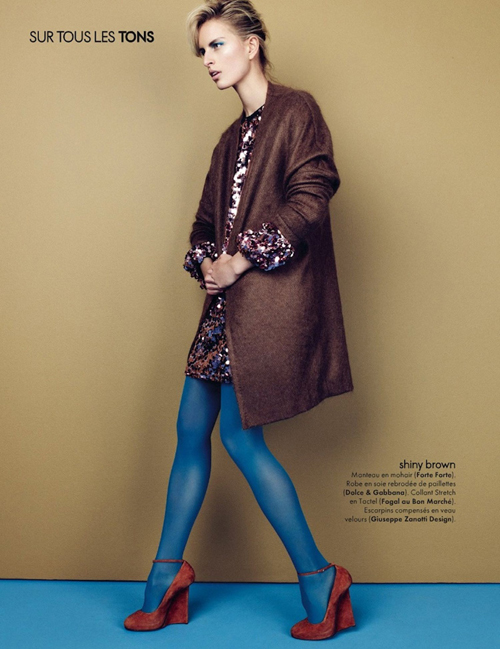 /Michele Beaurenaut dresses Karoline Kurkova in smart woman with wit style statements for Elle France December 2012. Strong color mixes plays primary role in ‘Sur Tous Les Tons’, lensed by Nagi Sakai.
